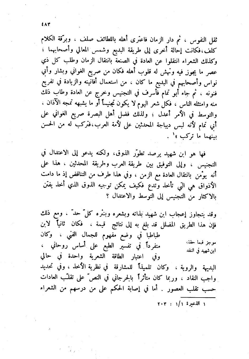 ثقل النفوس، ثم دار الزمان فاعترى أهله باللطائف صلف، وبرقة الكلام كلف، فكانت إحالة أخرى إلى طريقة البديع وشمس المعالي وأصحابهما؛ وكذلك الشعراء انتقلوا عن العادة في الصنعة بانتقال الزمان وطلب كل ذي عصر ما يجوز فيه وتهش له قلوب أهله فكان من صريع الغواني وبشار وأبي نواس وأصحابهم في البديع ما كان، من استعمال أفانينه والزيادة في تفريع فنونه، ثم جاء أبو تمام فأسرف في التجنيس وخرج عن العادة وطاب ذلك منه وامتثله الناس، فكل شعر اليوم لا يكون تجنيساً أو ما يشبهه تمجه الآذان، والتوسط في الأمر أعدل؛ ولذلك فضل أهل البصرة صريع الغواني على أبي تمام لأنه لبس ديباجة المحدثين على لأمة العرب، فتركب له من الحسن بينهما ما تركب " (1) .