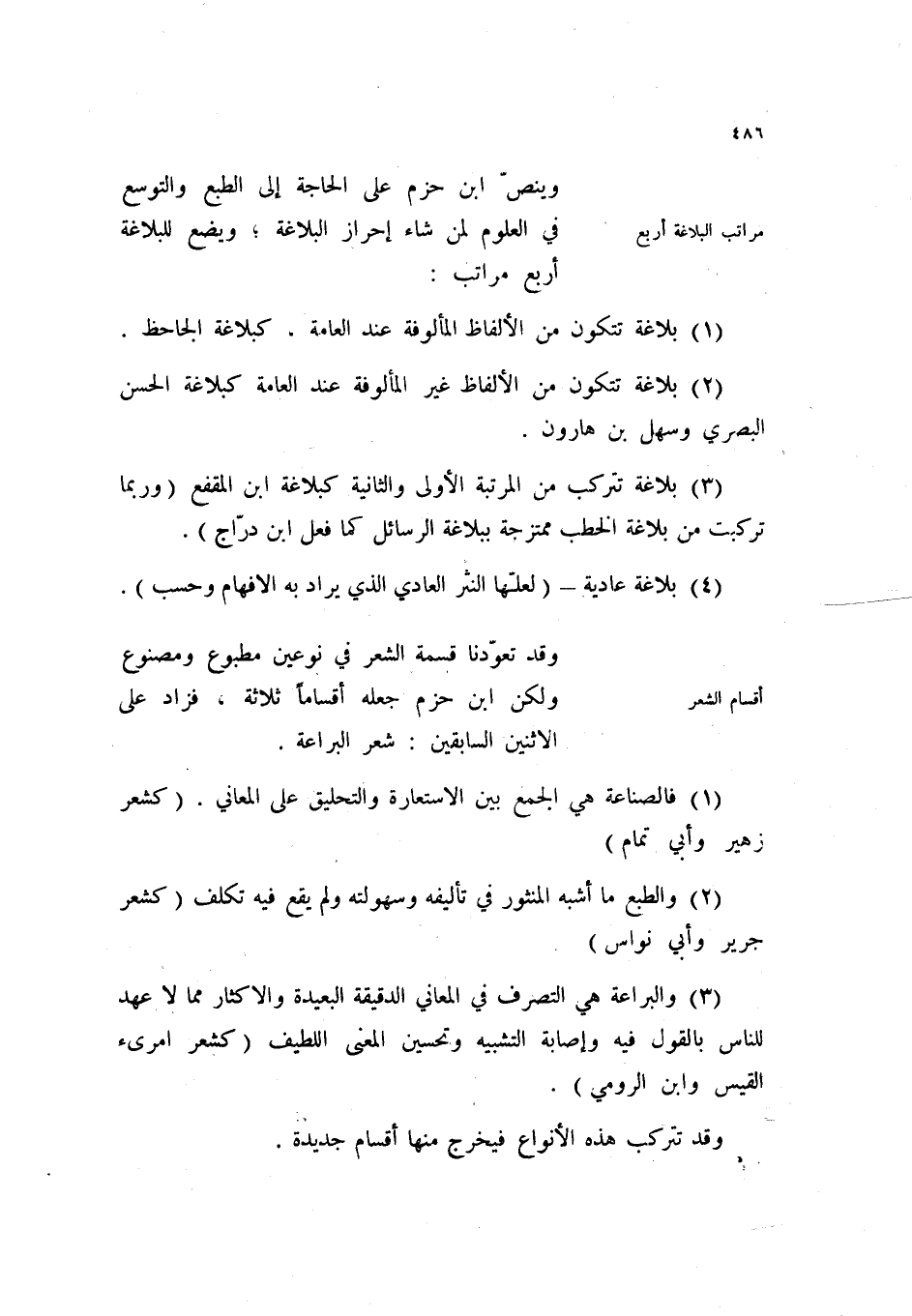 وقد تعودنا قسمة الشعر في نوعين مطبوع ومصنوع ولكن ابن حزم جعله أقساماً ثلاثة، فزاد على الاثنين السابقين: شعر البراعة.