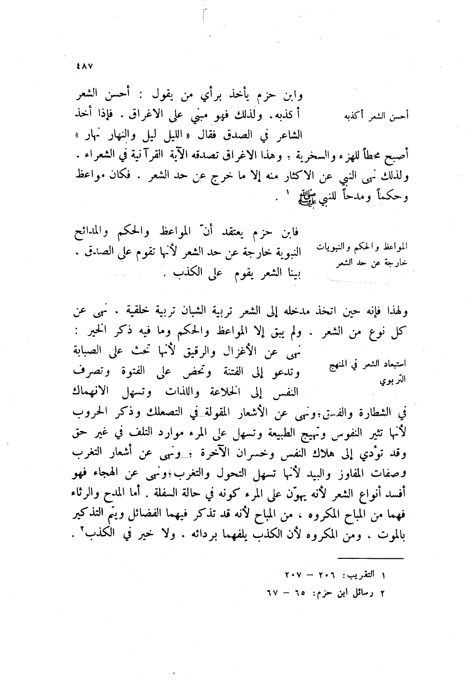 وابن حزم يأخذ برأي من يقولك أحسن الشعر أكذبه، ولذلك فهو مبني على الإغراق. فإذا أخذ الشاعر في الصدق فقال " الليل ليل والنهار نهار " أصبح محطاً للهزء والسخرية؛ وهذا الإغراق تصدقه الآية القرآنية في الشعراء. ولذلك نهى النبي عن الإكثار منه إلا ما خرج عن حد الشعر، فكان مواعظ وحكماً ومدحاً للنبي صلى الله عليه وسلم (1) .