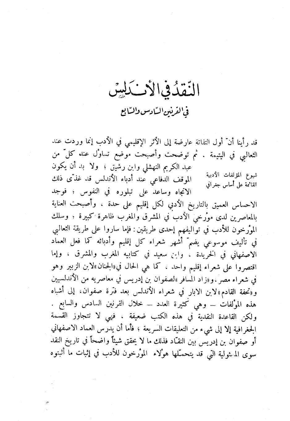 قد رأينا أول التفاتة عارضة إلى الأثر الإقليمي في الأدب إنما وردت عند الثعالبي في اليتيمة، ثم توضحت وأصبحت موضع تساؤل عند كل من عبد الكريم النهشلي وابن رشيق؛ ولا بد ان يكون الموقف الدفاعي عند أدباء الأندلس قد غذى ذلك الاتجاه وساعد على تبلوره في النفوس؛ فوجد الإحساس العميق بالتاريخ الأدبي لكل إقليم على حدة، وأصبحت العناية بالمعاصرين لدى مؤرخي الأدب في المشرق والمغرب ظاهرة كبيرة؛ وسلك المؤرخون للأدب في تواليفهم إحدى طريقين: فإما ساروا على طريقة الثعالبي في تأليف موسوعي يضم اشهر شعراء كل إقليم وأدبائه كما فعل العماد الأصفهاني في الخريدة، وابن سعيد في كتابه المغرب والمشرق، وإما اقتصروا على شعراء إقليم واحد، كما هي الحال في " الجنان " لابن الزبير وهو في شعراء مصر، و " زاد المسافر " لصفوان بن إدريس في معاصريه من الأندلسيين و " تحفة القادم " لابن الابار في شعراء الأندلس بعد فترة صفوان، إلى أشباه هذه المؤلفات - وهي كثيرة العدد - خلال القرنين السادس والسابع. ولكن القاعدة النقدية في هذه الكتب ضعيفة، فهي لا تتجاوز القسمة الجغرافية إلا إلى شيء من التعليقات السريعة؛ فأما أن يدرس العماد الأصفهاني أو صفوان بن إدريس بين النقاد فذلك ما لا يحقق شيئاً واضحاً في تاريخ النقد سوى المسئولية التي قد يتحملها هؤلاء المؤرخون للأدب في إثبات ما أثبتوه