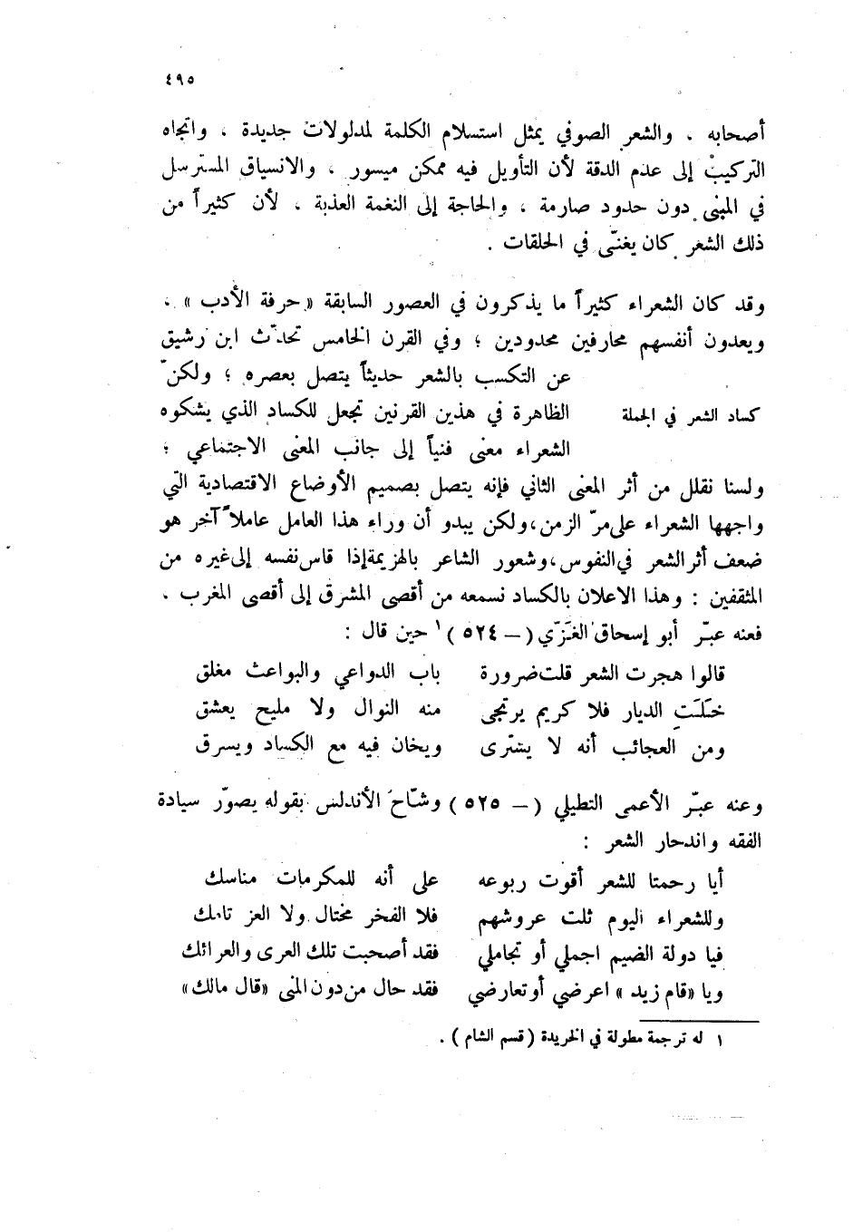 وقد كان الشعراء كثيراً ما يذكرون في العصور السابقة " حرفة الأدب "، ويعدون أنفسهم محارفين محدودين؛ وفي القرن الخامس تحدث ابن رشيق عن التكسب بالشعر حديثاً يتصل بعصره؛ ولكن الظاهرة في هذين القرنين تجعل للكساد الذي يشكوه الشعراء معنى فنياً إلى جانب المعنى الاجتماعي؛ ولسنا نقلل من أثر المعنى الثاني فإنه يتصل بصميم الأوضاع الاقتصادية التي واجهها الشعراء على مر الزمن، ولكن يبدو ان وراء هذا العامل عاملاً آخر هو ضعف أثر الشعر في النفوس، وشعور الشاعر بالهزيمة إذا قاس نفسه إلى غيره من المثقفين: وهذا الإعلان بالكساد نسمعه من أقصى المشرق إلى أقصى المغرب، فعنه عبر أبو إسحاق الغزي (- 524) (1) حين قال: