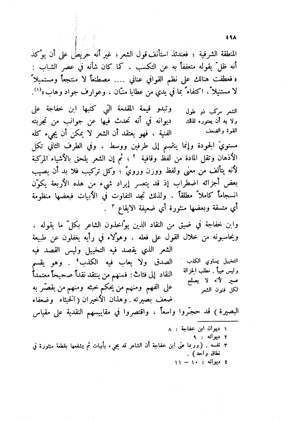 وابن خفاجة في ضيق من النقاد الذين يؤاخذون الشاعر بكل ما يقوله، ويحاسبونه من خلال القول على فعله، وهؤلاء في رأيه يغفلون عن طبيعة الشعر الذي يقصد فيه التخييل وليس القصد فيه الصدق ولا يعاب فيه الكذب (4) . وهو يقسم النقاد إلى فئات: فمنهم من ينتقد نقداً صحيحاً معتمداً على الفهم ومنهم من يحكم خبثه ومنهم من يقصر به ضعف بصيرته. وهذان الأخيران (الخبثاء وضعفاء البصيرة) قد حجروا واسعاً، واقتصروا في مقاييسهم النقدية على مقياس