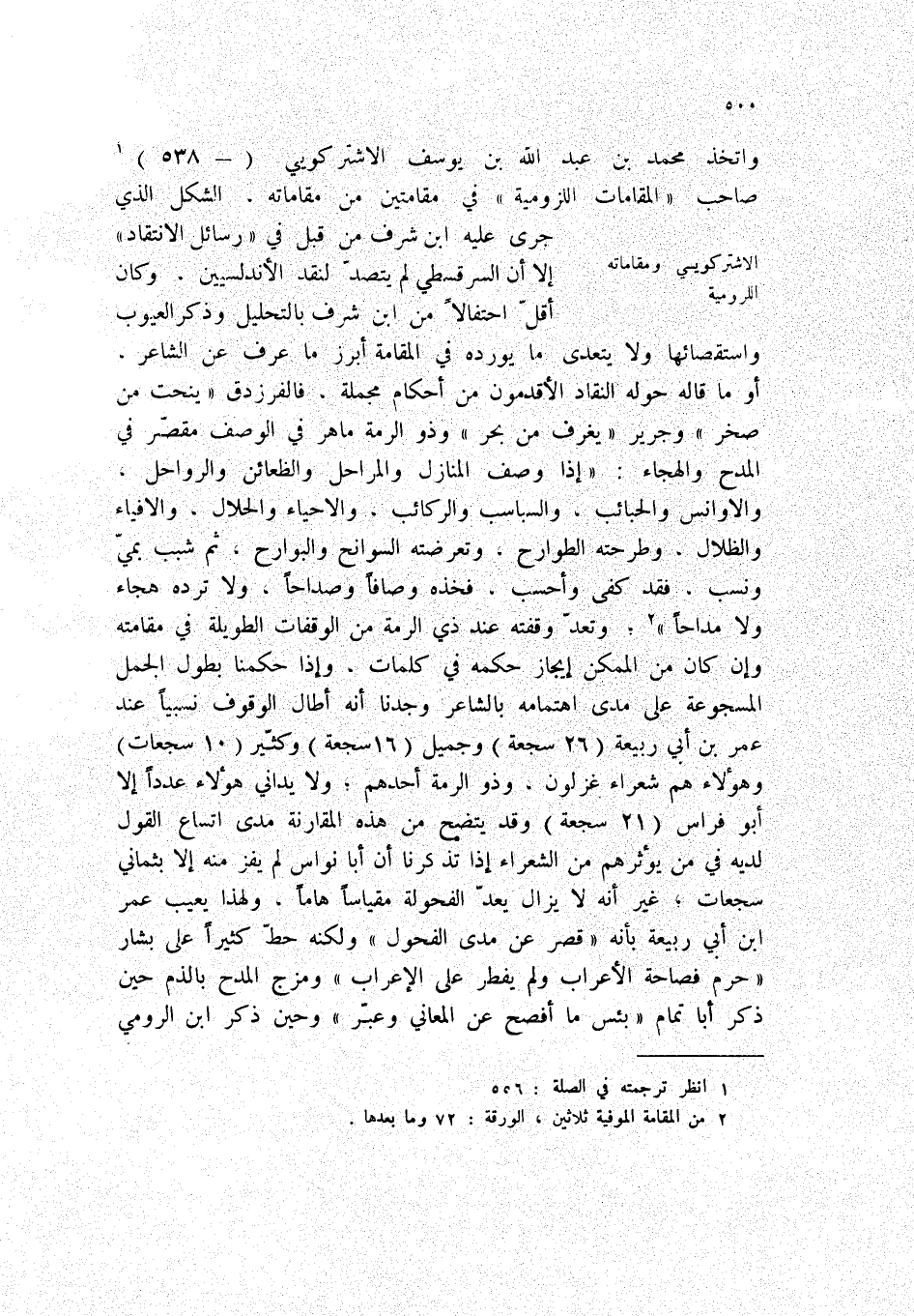 واتخذ محمد بن عبد الله بن يوسف الاشتركويي (- 538) (1) صاحب " المقامات اللزومية " في مقامتين من مقاماته، الشكل الذي جرى عليه ابن شرف من قبل في " رسائل الانتقاد " إلا أن السرقسطي لم يتصد لنقد الاندلسيين، وكان اقل احتفالاً من ابن شرف بالتحليل وذكر العيوب واستقصائها ولا يتعدى ما يورده في المقامة أبرز ما عرف عن الشاعر، أو ما قاله حوله النقاد الأقدمون من أحكام مجملة. فالفرزدق " بنحت من صخر " وجرير " يعرف من بحر " وذو الرمة ماهر في الوصف مقصر في المدح والهجاء: " إذا وصف المنازل والمراحل والظعائن والرواحل، والأوانس والحبائب، والسباسب والركائب، والأحياء والحلال، والافياء والظلال، وطرحته الطوارح، وتعرضته السوانح والبوارح، ثم شبب بمي ونسب، فقد كفى وأحسب، فخذه وصافاً وصداحاً، ولا ترده هجاء ولا مداحاً " (2) ؛ وتعد وقفته عند ذي الرمة من الوقفات الطويلة في مقامته وإن كان من الممكن إيجاز حكمه في كلمات، وإذا حكمنا بطول الجمل المسجوعة على مدى اهتمامه بالشاعر وجدنا انه أطال الوقوف نسبياً عند عمر بن أبي ربيعة (26 سجعة) وجميل (16 سجعة) وكثير (10 سجعات) وهؤلاء هم شعراء غزلون، وذو الرمة أحدهم؛ ولا يداني هؤلاء عدداً إلا أبو فراس (21 سجعة) وقد يتضح من هذه المقارنة مدى اتساع القول لديه في من يؤثرهم من الشعراء إذا تذكرنا أن أبا نواس لم يفز منه إلا بثماني سجعات؛ غير انه لا يزال يعد الفحولة مقياساً هاماً، ولهذا يعيب عمر ابن أبي ربيعة بأنه " قصر عن مدى الفحول " ولكنه حط كثيراً على بشار " حرم فصاحة الأعراب ولم يفطر على الإعراب " ومزج المدح بالذم حين ذكر أبا تمام " بئس ما أفصح عن المعاني وعبر " وحين ذكر ابن الرومي