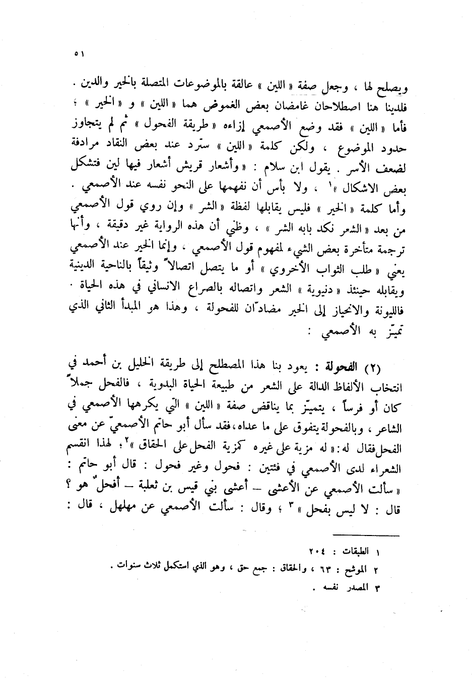 (2) الفحولة: يعود بنا هذا المصطلح إلى طريقة الخليل بن أحمد في انتخاب الألفاظ الدالة على الشعر من طبيعة الحياة البدوية، فالفحل جملاً كان أو فرساً، يتميز بما يناقض صفة " اللين " التي يكرهها الأصمعي في الشاعر، وبالفحولة يتفوق على ما عداه، فقد سال أبو حاتم الأصمعي عن معنى الفحل فقال له: " له مزية على غيره كمزية الفحل على الحقاق " (2) ؛ لهذا انقسم الشعراء لدى الأصمعي في فئتين: فحول وغير فحول: قال أبو حاتم: " سالت الأصمعي عن الأعشى - أعشى بني قيس بن ثعلبة - أفحل هو؟ قال: لا ليس بفحل " (3) ؛ وقال: سالت الأصمعي عن مهلهل، قال: