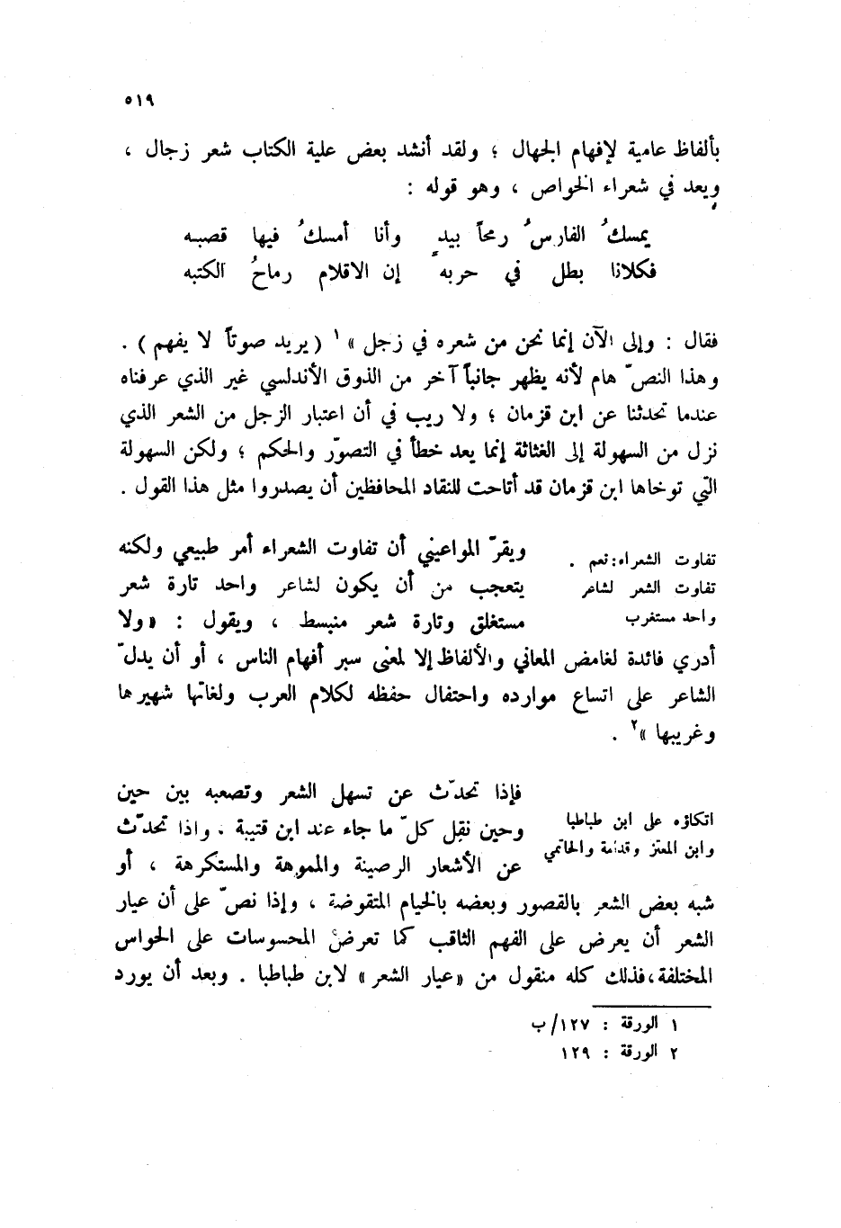 فكلانا بطل في حربه ... عن الأقلام رماح الكتبه فقال: وإلى الآن إنما نحن من شعره في زجل " (1) (يريد صوتاً لا يفهم) . وهذا النص هام لأنه يظهر جانباً آخر من الذوق الأندلسي غير الذي عرفناه عندما تحدثنا عن ابن قزمان؛ ولا ريب في أن اعتبار الزجل من الشعر الذي نزل من السهولة إلى الغثاثة إنما يعد خطأ في التصور والحكم؛ ولكن السهولة التي توخاها ابن قزمان قد أتاحت للنقاد المحافظين أن يصدروا مثل القول.