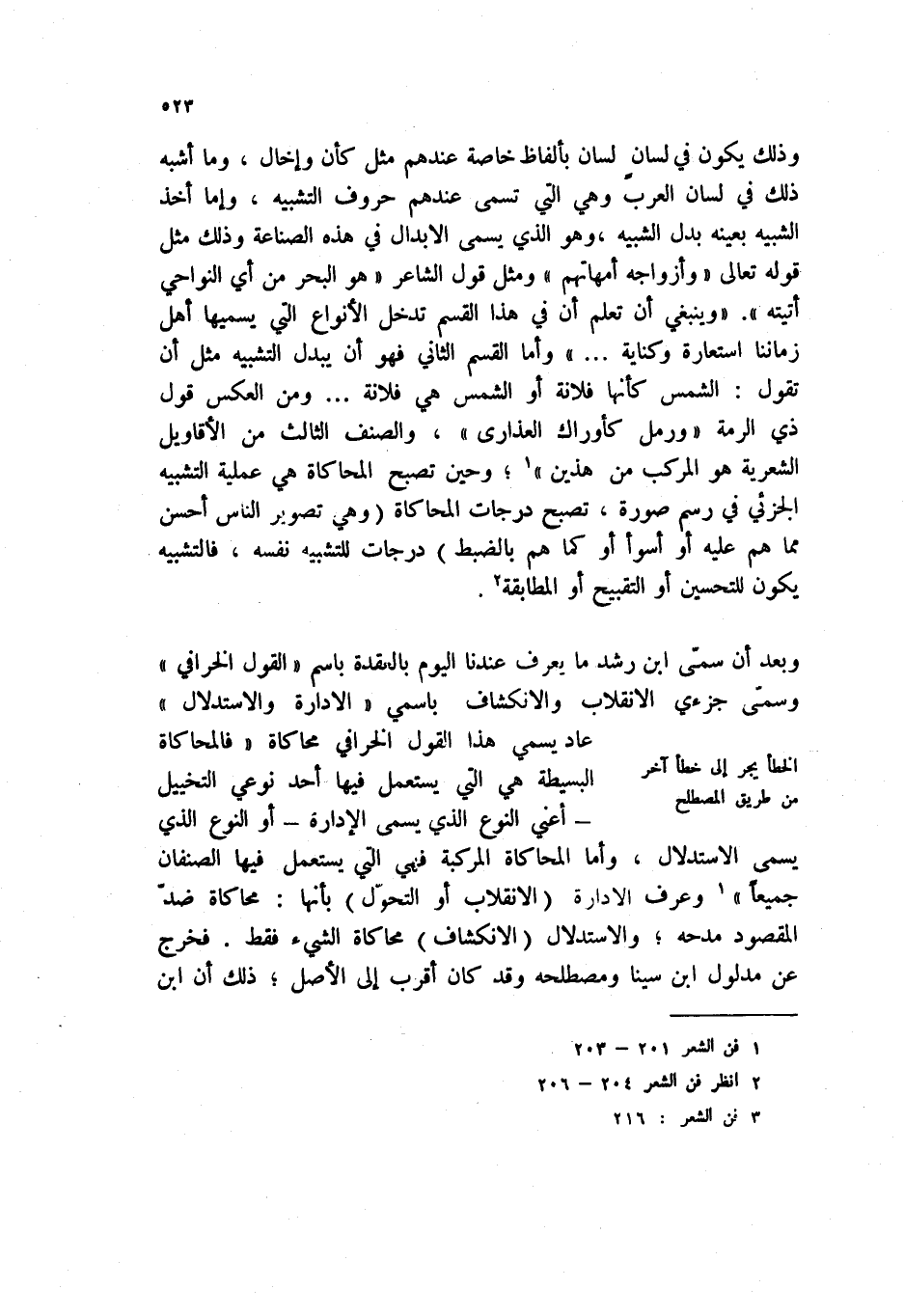 وذلك يكون في لسان بألفاظ خاصة عندهم مثل كأن وأخال، وما أشبه ذلك في لسان العرب وهي التي تسمى عندهم حروف التشبه، وإما أخذ الشبيه بعينه بدل الشبيه، وهو الذي يسمى الإبدال في هذه الصناعة وذلك مثل قوله تعالى " وأزواجه أمهاتهم " ومثل قول الشاعر " هو البحر من أي النواحي أتيته ". " وينبغي أن تعلم أن في هذا القسم تدخل الأنواع التي يسميها أهل زماننا استعارة وكتابة؟ " وأما القسم الثاني فهو أن يبدل التشبيه مثل أن تقول: الشمس كأنها فلانة أو الشمس هي فلانة؟ ومن العكس قول ذي الرمة " ورمل كأوراك العذارى "، والصنف الثالث من الأقاويل الشعرية هو المركب من هذين " (1) ؛ وحين تصبح المحاكاة هي عملية التشبيه الجزئي في رسم صورة، تصبح درجات المحاكاة (وهي تصوير الناس أحسن مما هم عليه أو أسوأ أو كما هم بالضبط) درجات للتشبيه نفسه، فالتشبيه يكون للتحسين أو التقبيح أو المطابقة (2) .