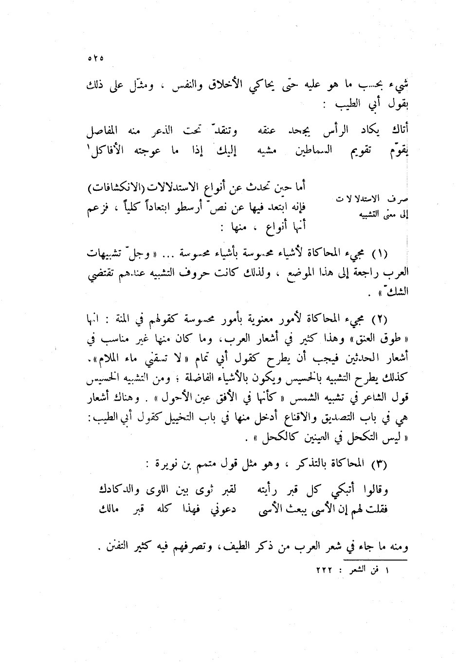 (1) مجيء المحاكاة لأشياء محسوسة بأشياء محسوسة؟ " وجل تشبيهات العرب راجعة إلى هذا الموضع، ولذلك كانت حروف التشبيه عندهم تقتضي الشك ".