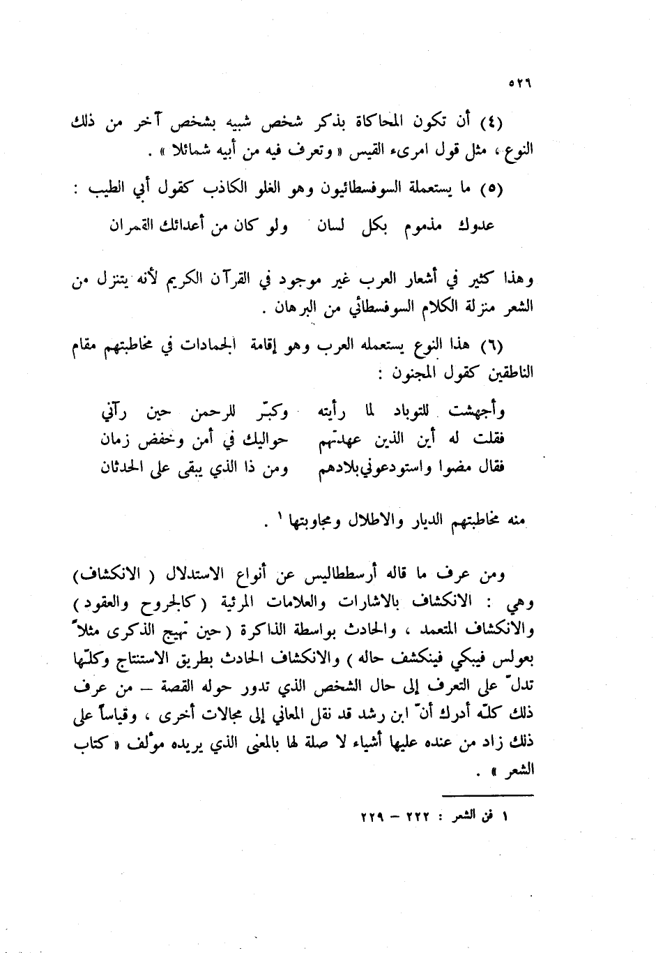 ومن عرف ما قاله أرسططاليس عن أنواع الاستدلال (الانكشاف) وهي: الانكشاف بالإشارات والعلامات المرئية (كالجروح والعقود) والانكشاف المتعمد، والحادث بواسطة الذاكرة (حين تهيج الذكرى مثلاً بعولس فيبكي فينكشف حاله) والانكشاف الحادث بطريق الاستنتاج وكلها تدل على التعرف إلى حال الشخص الذي تدور حوله القصة - من عرف ذلك كله أدرك أن أبن رشد قد نقل المعاني إلى مجالات أخرى، وقياساً على ذلك زاد من عنده عليها أشياء لا صلة لها بالمعنى الذي يريده مؤلف " كتاب الشعر ".