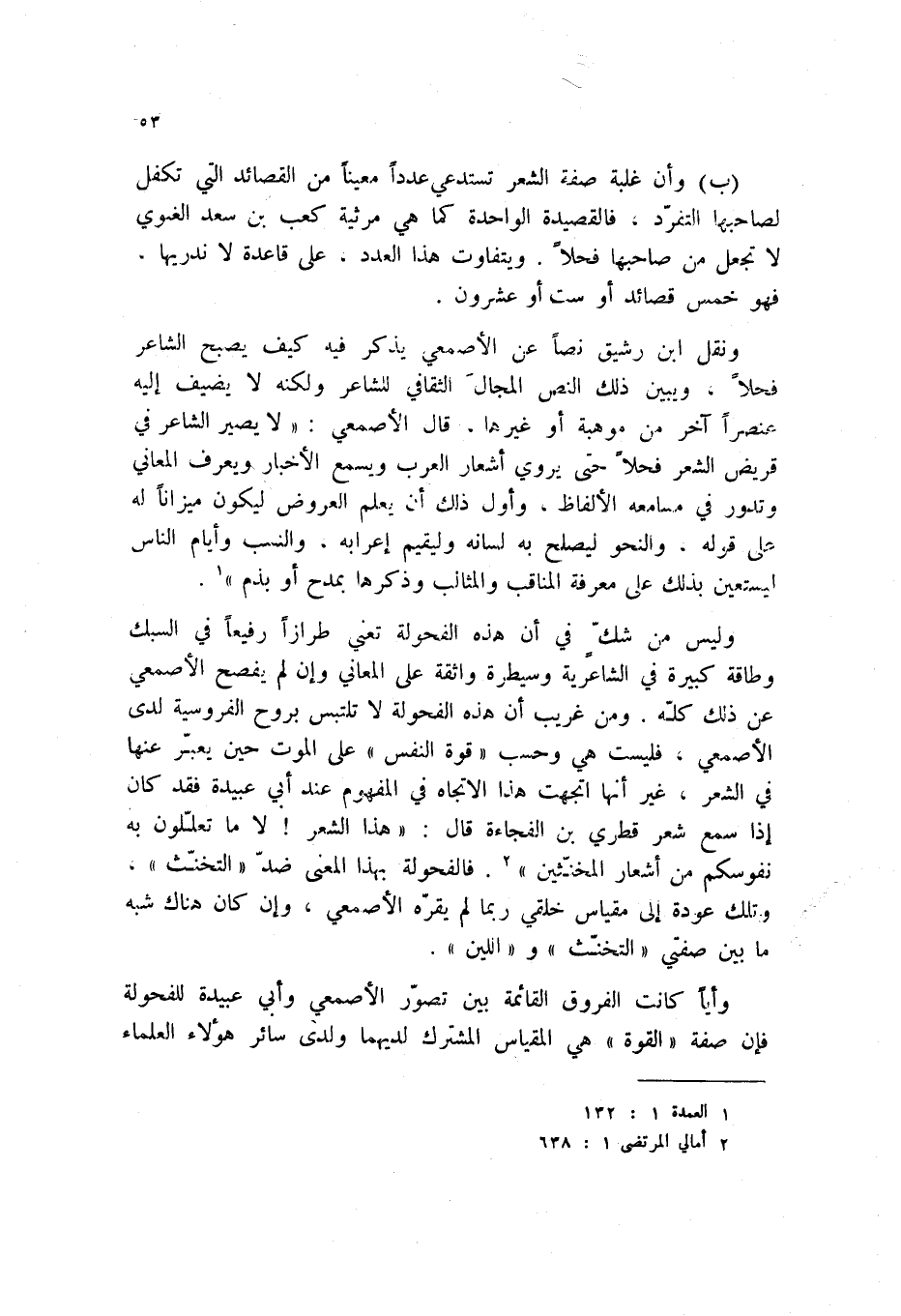 وليس من شك في أن هذه الفحولة تعني طرازاً رفيعاً في السبك وطاقة كبيرة في الشاعرية وسيطرة واثقة على المعاني وإن لم يفصح الأصمعي عن ذلك كله. ومن غريب ان هذه الفحولة لا تلتبس بروح الفروسية لدى الأصمعي، فليست هي وحسب " قوة النفس " على الموت حين يعبر عنها في الشعر، غير أنها اتجهت هذا الاتجاه في المفهوم عند أبي عبيدة فقد كان إذا سمع شعر قطري بن الفجاءة قال: " هذا الشعر! لا ما تعللون به نفوسكم من أشعار المخنثين " (2) . فالفحولة بهذا المعنى ضد " التخنث "، وتلك عودة إلى مقياس خلقي ربما لم يقره الأصمعي، وإن كان هناك شبه ما بين صفتي " التخنث " و " اللين ".