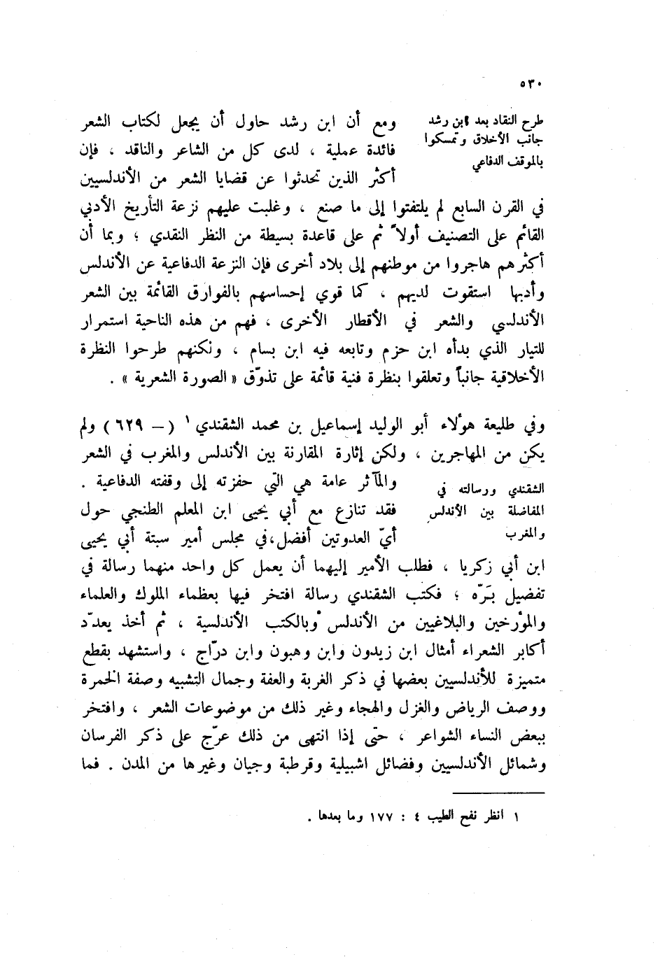 ومع أن أبن رشد حاول أن يجعل لكتاب الشعر فائدة عملية، لدى كل من الشاعر والناقد، فإن أكثر الذين تحدثوا عن قضايا الشعر من الأندلسيين في القرن السابع لم يلتفتوا إلى ما صنع، وغلبت عليهم نزعة التأريخ الأدبي القائم على التصنيف أولاً ثم على قاعدة بسيطة من النظر النقدي؛ وبما أن أكثرهم هاجروا من موطنهم إلى بلاد أخرى فإن النزعة الدفاعية عن الأندلس وأدبها استقوت لديهم، كما قوي إحساسهم بالفوارق القائمة بين الشعر الأندلسي والشعر في الأقطار الأخرى، فهم من هذه الناحية استمرار للتيار الذي بدأه أبن حزم وتابعه فيه أبن بسام، ولكنهم طرحوا النظرة الأخلاقية جانباً وتعلقوا بنظرة فنية قائمة على تذوق " الصورة الشعرية ".