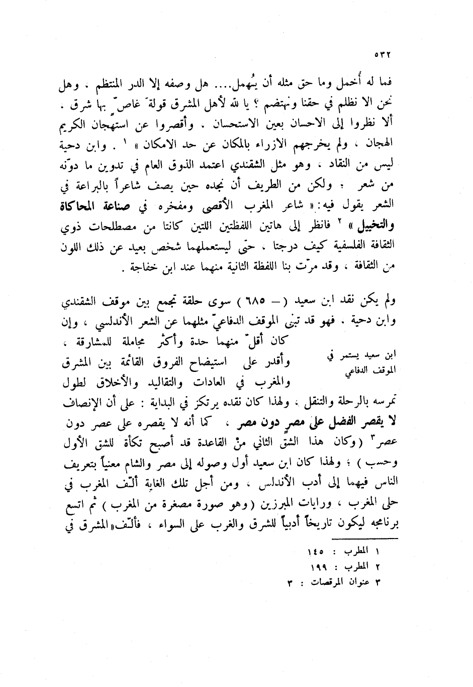 ولم يكن نقد ابن سعيد (- 685) سوى حلقة تجمع بين موقف الشقندي وابن دحية، فهو تبنى الموقف الدفاعي مثلهما عن الشعر الأندلسي، وإن كان أقل منهما حدة واكثر مجاملة للمشارقة، واقدر على استيضاح الفروق القائمة بين المشرق والمغرب في العادات والتقاليد والأخلاق لطول تمرسه بالرحلة والتنقل، ولهذا كان نقده يرتكز في البداية: على أن الإنصاف لا يقصر الفضل على مصر دون مصر، كما انه لا يقصره على مصر دون عصر (3) (وكان هذا الشق الثاني من القاعدة قد أصبح تكأة للشق الأول وحسب) ؛ ولهذا كان ابن سعيد أول وصوله إلى مصر والشام معنياً بتعريف الناس فيهما إلى أدب الأندلس، ومن اجل تلك الغاية ألف المغرب في برنامجه ليكون تاريخاً أدبياً للشرق والغرب على السواء، فألف " المشرق في