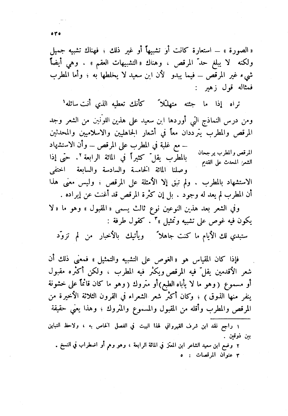 ستبدي لك الأيام ما كنت جاهلاً ... ويأتيك بالأخبار من لم تزود فإذا كان المقياس هو " الغوص على التشبيه والتمثيل " فمعنى ذلك أن شعر الأقدمين يقل فيه المرقص ويكثر فيه المطرب، ولكن أكثره مقبول أو مسموع (وهو ما لا يأباه الطبع) أو متروك (وهو ما كان قائماً على خشونة ينفر منها الذوق) ؛ وكان اكثر شعر الشعراء في القرون الثلاثة الأخيرة من المرقص والمطرب واقله من المقبول والمسموع والمتروك؛ وهذا يعني حقيقة