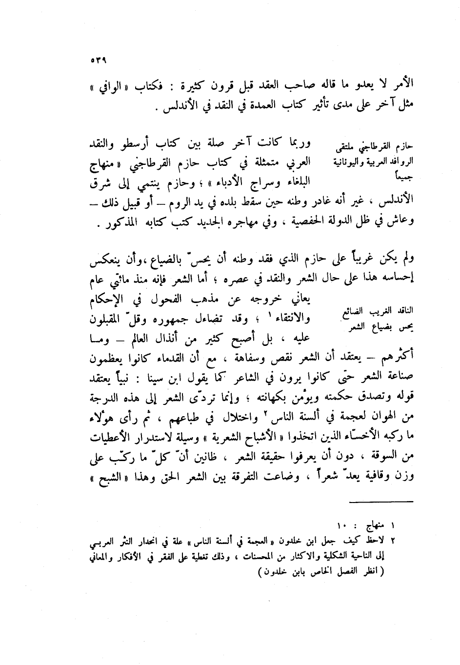 وربما كانت آخر صلة بين كتاب أرسطو والنقد العربي متمثلة في كتاب حازم القرطاجني " منهاج البلغاء وسراج الأدباء "؛ وحازم ينتمي إلى شرق الأندلس، غير انه غادر وطنه حين سقط بلده في يد الرومس أو قبيل لك وعاش في ظل الدولة الحفصية، وفي مهاجره الجديد كتب كتابه المذكور.