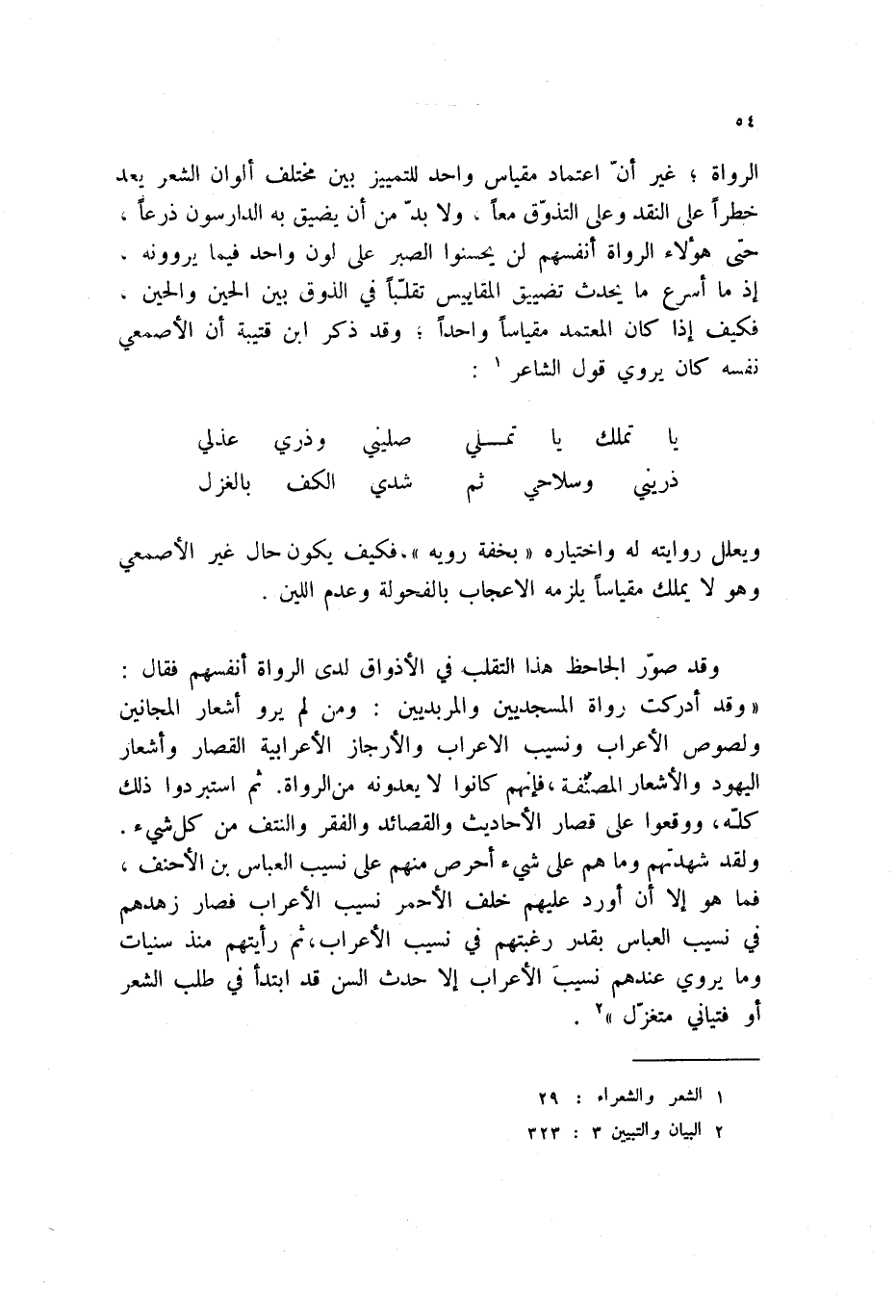 الرواة؛ غير أن اعتماد مقياس واحد للتمييز بين مختلف ألوان الشعر يعد خطراً على النقد وعلى التذوق معاً، ولابد من أن يضيق به الدارسون ذرعاً، حتى هؤلاء الرواة أنفسهم لن يحسنوا الصبر على لون واحد فيما يرونه. إذ ما أسرع ما يحدث تضييق المقاييس تقلباً في الذوق بين الحين والحين، فكيف إذا كان المعتمد مقياساً واحداً؛ وقد ذكر ابن قتيبة أن الأصمعي نفسه كان يروي قول الشاعر (1) :