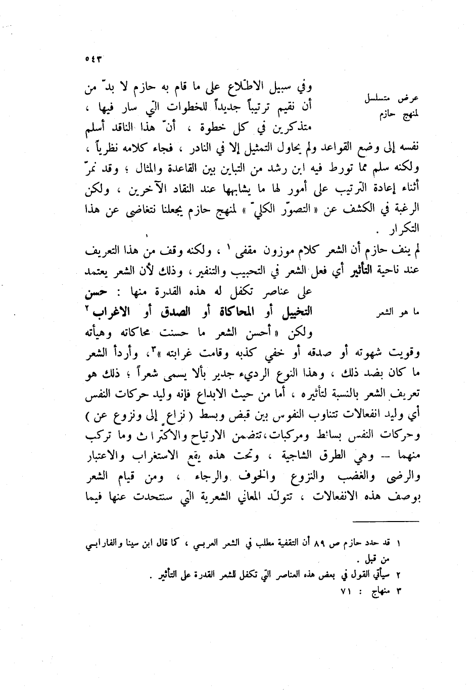 وفي سبيل الاطلاع على ما قاد به حازم لابد من أن تقيم ترتيباً جديداً للخطوات التي سار فيها، متذكرين في كل خطوة، إن هذا الناقد أسلم نفسه إلى وضع القواعد ولم يحاول التمثيل إلا في النادر، فجاء كلامه نظرياً، ولكنه سلم مما تورط فيه ابن رشد من التباين بين القاعدة والمثال؛ وقد نمر أثناء إعادة الترتيب على أمور لها ما يشابهها عند النقاد الآخرين، ولكن الرغبة في الكشف عن " التصور الكلي " لمنهج حازم يجعلنا نتغاضى عن هذا التكرار.