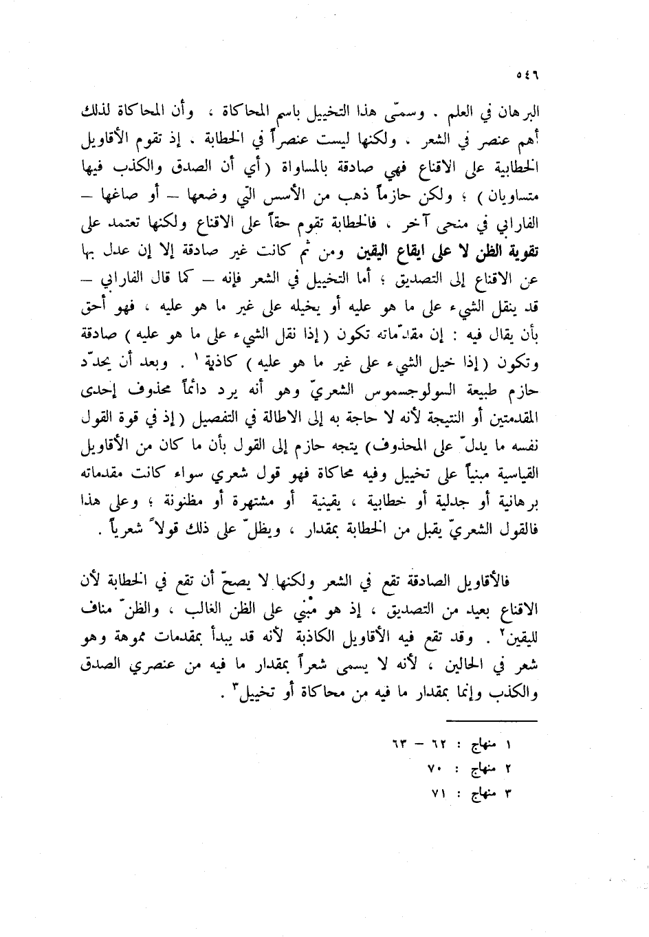 البرهان في العلم. وسمى هذا التخييل باسم المحاكاة، وان المحاكاة لذلك أهم عنصر في الشعر، ولكنها ليست عنصراً في الخطابة، إذ تقوم الأقاويل الخطابية على الإقناع فهي صادقة بالمساواة (أي أن الصدق والكذب فيها متساويان) ؛ ولكن حازما ذهب من الأسس التي وضعها - أو صاغها - الفارابي في منحى آخر. فالخطابة تقوم حقاً على الإقناع ولكنها تعتمد على تقوية الظن لا على إيقاع اليقين ومن ثم كانت غير صادقة إلا أن عدل بها عن الإقناع إلى التصديق؛ أما التخييل في الشعر فإنه - كما قال الفارابي - قد ينقل الشيء على ما هو عليه أو يخيله على غير ما هو عليه، فهو أحق بأن يقال فيه: إن مقدماته تكون (إذا نقل الشيء على ما هو عليه) صادقة وتكون (إذا خيل الشيء على غير ما هو عليه) كاذبة (1) . وبعد أن يحدد حازم طبيعة السولوجسموس الشعري وهو أنه يرد دائماً محذوف إحدى المقدمتين أو النتيجة لأنه لا حاجة به إلى الإطالة في التفصيل (إذ في قوة القول نفسه ما يدل على المحذوف) يتجه حازم إلى القول بأن ما كان من الأقاويل القياسية مبنياً على تخييل وفيه محاكاة فهو قول شعري سواء كانت مقدماته برهانية أو جدلية أو خطابية، يقينية أو مشتهرة أو مظنونة؛ وعلى هذا فالقول الشعري يقبل من الخطابة بمقدار، ويظل على ذلك قولاً شعرياً.