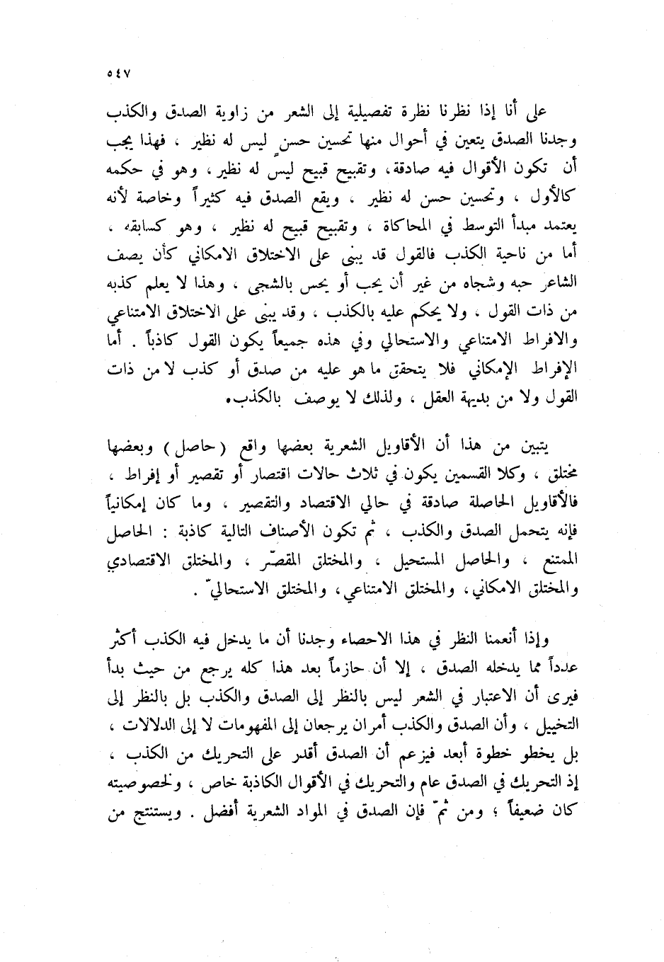 على أنا إذا نظرنا نظرة تفصيلية إلى الشعر من زاوية الصدق والكذب وجدنا الصدق يتعين في أحوال منها تحسين حسن ليس له نظير، فهذا يجب أن تكون الأقوال فيه صادقة، وتقبيح قبيح ليس له نظير، وهو في حكمه كالاول، وتحسين حسن له نظير، ويقع الصدق فيه كثيراً وخاصة لأنه يعتمد مبدأ التوسط في المحاكاة، وتقبيح قبيح له نظير، وهو كسابقه، أما من ناحية الكذب فالقول قد يبنى على الاختلاق الإمكاني كأن يصف الشاعر حبه وشجاه من غير أن يحب أو يحس بالشجى، وهذا لا يعلم كذبه من ذات القول، ولا يحكم عليه بالكذب، وقد يبنى على الاختلاق الإمتناعي والإفراط الإمتناعي والإستحالي وفي هذه جميعاً يكون القول كاذباً. أما الإفراط الإمكاني فلا يتحقق ما هو عليه من صدق أو كذب لا من ذات القول ولا من بديهة العقل، ولذلك لا يوصف بالكذب.