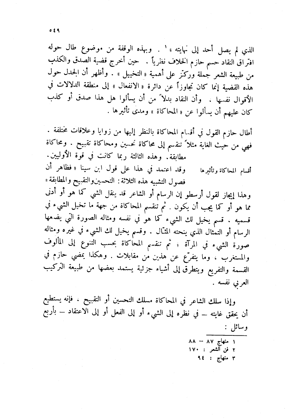 الذي لم يصل أحد إلى نهايته " (1) . وبهذه الوقفة من موضوع طال حوله افتراق النقاد حسم حازم الخلاف نظرياً، حين أخرج قضية الصدق والكذب من طبيعة الشعر جملة وركز على أهمية " التخييل ". وأظهر أن الجدل حول هذه القضية إنما كان تجاوزاً عن دائرة " الانفعال " إلى منطقة الدلالات في الأقوال نفسها، وإن النقاد بدلاً من أن يسألوا هل هذا صدق أو كذب كان عليهم أن يسألوا عن " المحاكاة " ومدى تأثيرها.