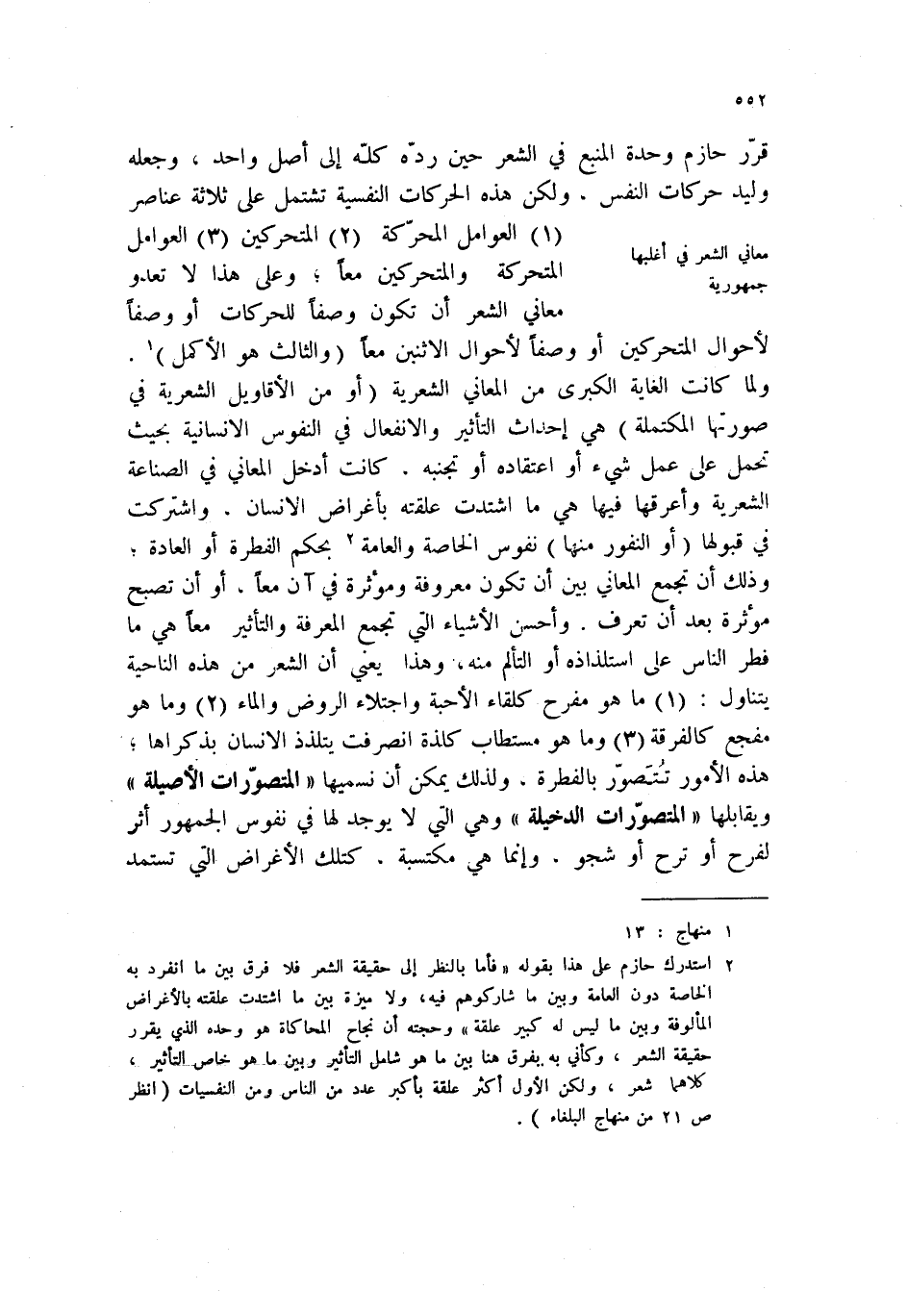 (2) استدرك حازم على هذا بقوله " فأما بالنظر إلى حقيقة الشعر فلا فرق بين ما انفرد به الخاصة دون العامة وبين ما شاركوهم فيه، ولا ميزة بين ما اشتدت علقته بالأغراض المألوفة وبين ما ليس له كبير علقة " وحجته أن نجاح المحاكاة هو وحده الذي يقرر حقيقة الشعر، وكأني به يفرق هنا بين ما هو شامل وبين ما هو خاص التأثير، كلاهما شعر، ولكن الأول أكثر علقة بأكبر عدد من الناس ومن النفسيات (أنظر ص 21 من منهاج البلغاء) .