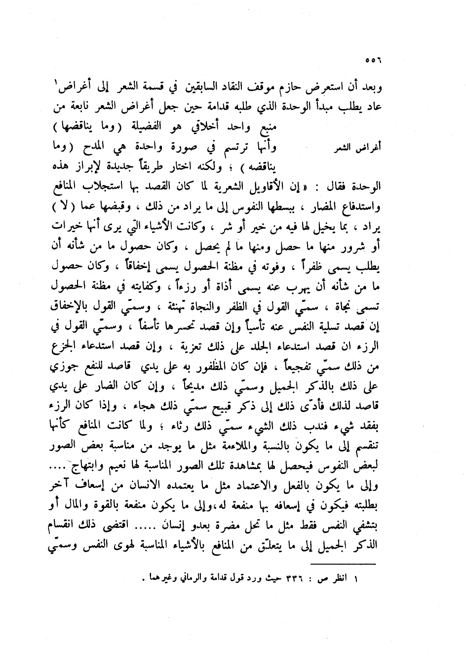 وبعد ان استعرض حازم موقف النقاد السابقين في قسمة الشعر إلى أغراض (1) عاد يطلب مبدأ الوحدة الذي طلبه قدامة حين جعل أغراض الشعر نابعة من منبع واحد أخلاقي هو الفضيلة (وما يناقضها) وإنها ترتسم في صورة واحدة هي المدح (وما يناقضه) ؛ ولكنه اختار طريقاً جديدة لإبراز هذه الوحدة فقال: " عن الأقاويل الشعرية لما كان القصد بها استجلاب المنافع واستدفاع المضار، ببسطها النفوس إلى ما يراد من ذلك، وقبضها عما (لا) يراد، بما يخيل لها فيه من خير أو شر، وكانت الأشياء التي يرى إنها خيرات أو شرور منها ما حصل ومنها ما لم يحصل، وكان حصول ما من شأنه أن يطلب يسمى ظفراً، وفوته في مظنة الحصول يسمى إخفاقاً، وكان حصول ما من شأنه أن يهرب عنه يسمى أذاه أو رزءاً، وكفايته في مظنة الحصول تسمى نجاة، سمي القول في الظفر والنجاة تهنئة، وسمي القول بالإخفاق إن قصد تسلية النفس عنه تأسياً وإن قصد تحسرها تأسفاً، وسمي القول في الرزء ان قصد استدعاء الجلد على ذلك تعزية، وإن قصد استدعاء الجزع من ذلك سمي تفجيعاً، فإن كان المظفور به على يدي قاصد للنفع جوزي على ذلك بالذكر الجميل وسمي ذلك مديحاً، وإن كان الضار على يدي قاصد لذلك فادى ذلك إلى ذكر قبيح سمي ذلك هجاء، وإذا كان الرزء يفقد شيء فندب ذلك الشيء سمي ذلك رثاء؛ ولما كانت المنافع كأنها تنقسم إلى ما يكون بالنسبة والملاءمة مثل ما يوجد من مناسبة بعض الصور لبعض النفوس فيحصل لها بمشاهدة تلك الصور المناسبة لها نعيم وابتهاج؟. وغلى ما يكون بالفعل والاعتماد مثل ما يعتمده الإنسان من إسعاف آخر بطلبته فيكون في إسعافه بها منفعة له، وإلى ما يكون منفعة بالقوة والمال أو بتشفي النفس فقط مثل ما تحل مضرة بعدو إنسان؟.. اقتضى ذلك انقسام الذكر الجميل إلى ما يتعلق من المنافع بالأشياء المناسبة لهوى النفس وسمي