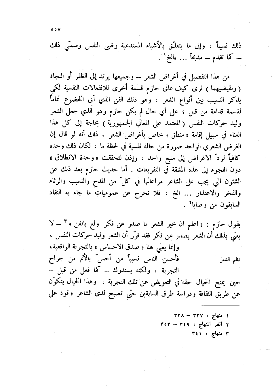 من هذا التفصيل في أغراض الشعر - وجميعها يرتد إلى الظفر أو النجاة (وتقيضيهما) نرى كيف عانى حازم قسمة أخرى للانفعالات النفسية لكي يذكر النسيب بين أنواع الشعر. وهو ذلك الفن الذي أبى الخضوع تماماً لقسمة قدامة من قبل؛ على أي حال لم يكن حازم وهو الذي جعل الشعر وليد حركات النفس (المعتمد على المعاني الجمهورية) بحاجة إلى كل هذا العناء في سبيل إقامة " منطق " خاص بأغراض الشعر، ذلك انه لو قال أن الغرض الشعري الواحد صورة من حالة نفسية في لحظة ما، لكان ذلك وحده كافياً لرد الأغراض إلى منبع واحد، وإذن لتحققت " وحدة الانطلاق " دون اللجوء إلى هذه المشقة في التفريعات. أما حديث حازم بعد ذلك عن الشئون التي يجب على الشاعر مراعاتها في كل من المدح والنسيب والرثاء والفخر والاعتذار؟ الخ، فلا تخرج عن عموميات ما جاء به النقاد السابقون من وصايا (2) .
