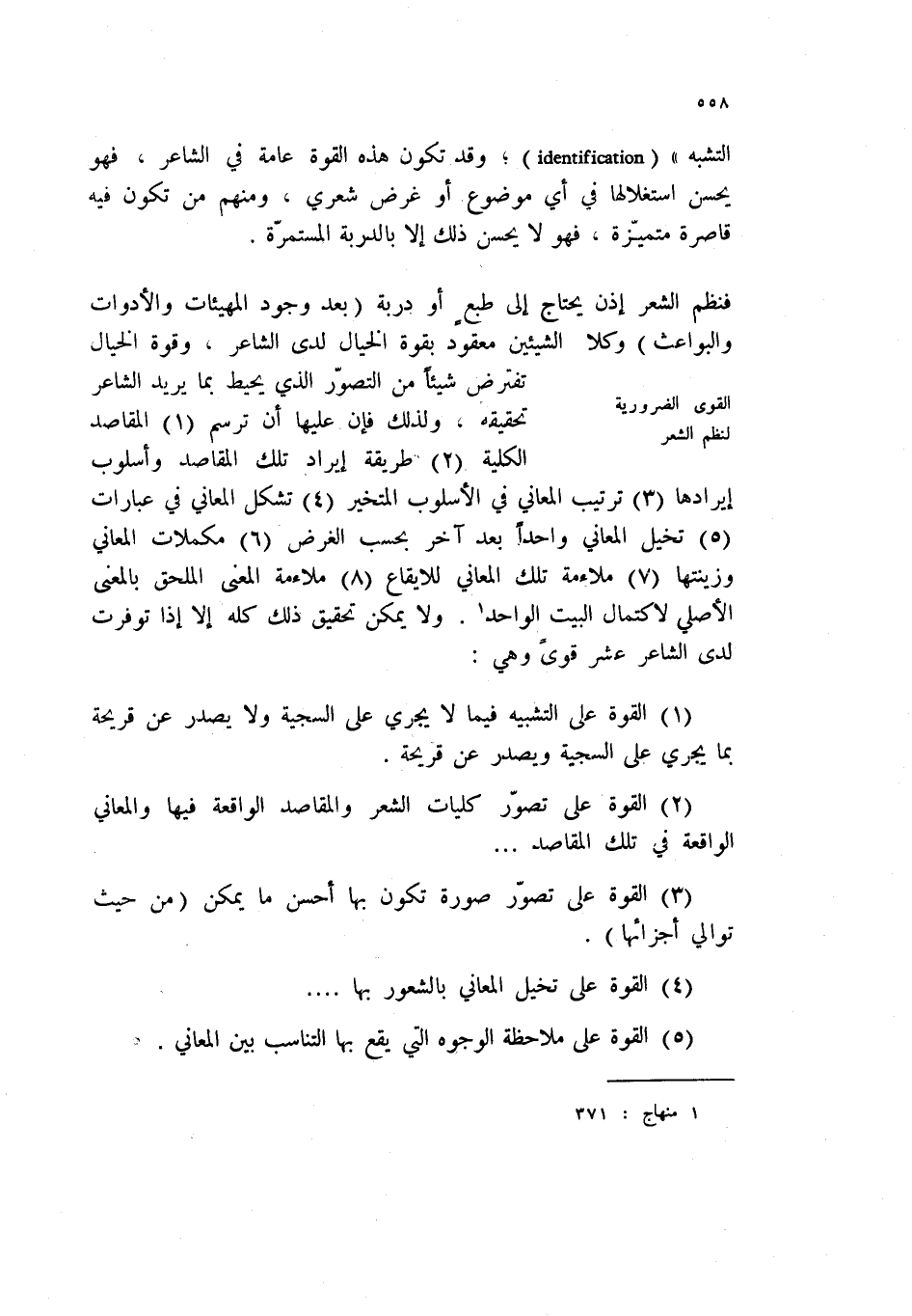 التشبه " (identification) ؛ وقد تكون هذه القوة عامة في الشاعر، فهو يحسن استغلالها في أي موضوع أو غرض شعري، ومنهم من تكون فيه قاصرة متميزة، فهو لا يحسن ذلك إلا بالدرجة المستمرة.