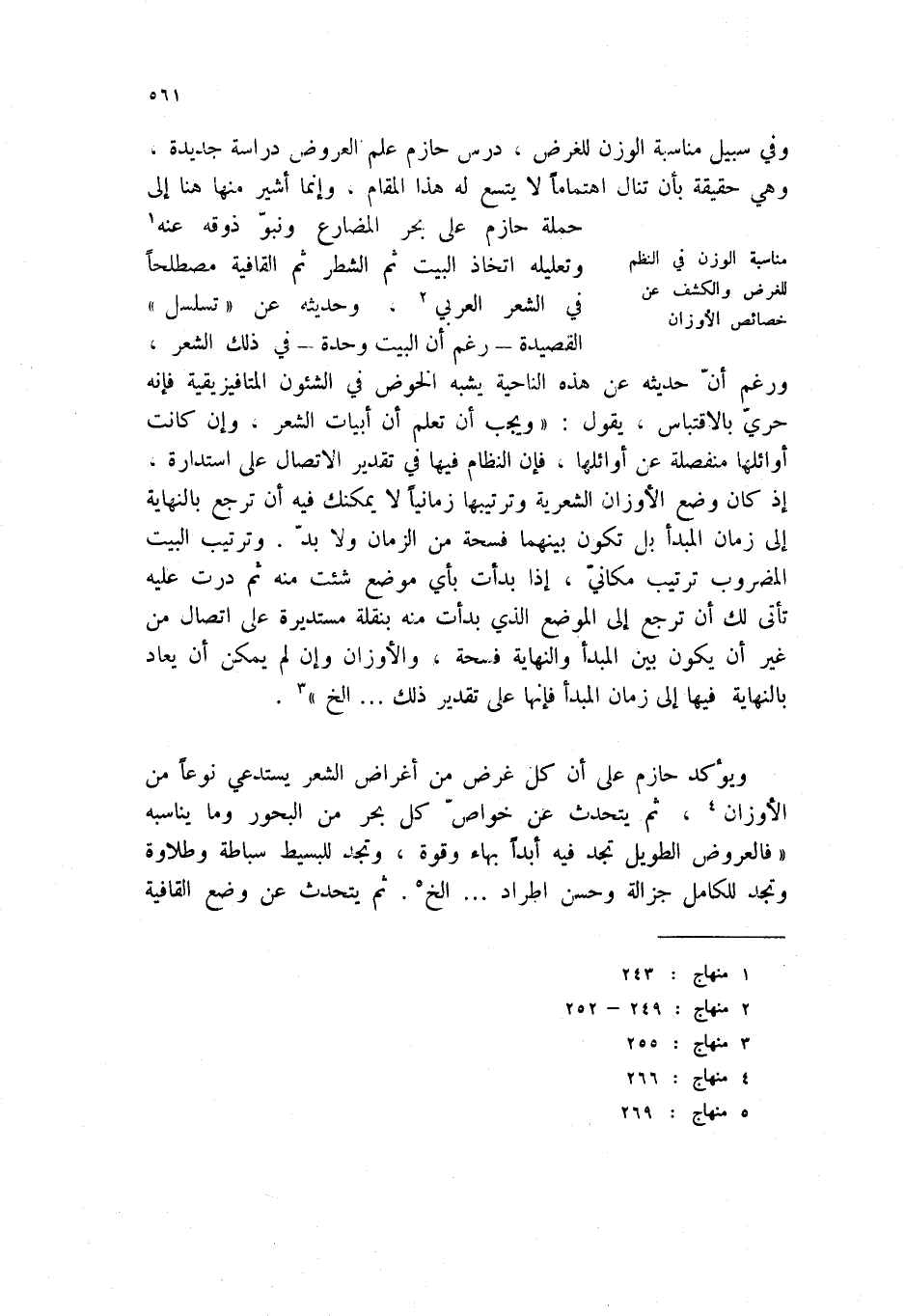 وفي سبيل مناسبة الوزن للغرض، درس حازم علم العروض دراسة جديدة وهي حقيقة بان تنال اهتماماً لا يتسع له هذا المقام، وإنما أشير منها هنا إلى حملة حازم على بحر المضارع ونبو ذوقه عنه (1) وتعليله اتخاذ البيت ثم الشطر ثم القافية مصطلحاً في الشعر العربي (2) ، وحديثه عن " تسلسل " القصيدة - رغم أن البيت وحده - في ذلك الشعر، ورغم ان حديثه عن هذه الناحية يشبه الخوض في الشئون المتافيزيقية فإنه حري بالاقتباس، يقول: " ويجب أن تعلم أن أبيات الشعر، وإن كانت أوئلها منفصلة عن اوئلها، فإن النظام فيها في تقرير الاتصال على استدارة، إذ كان وضع الأوزان الشعرية وترتيبها زمانياً لا يمكنك فيه ان ترجع بالنهاية إلى زمان المبدأ بل تكون بينهما فسحة من الزمان ولابد. وترتيب البيت المضروب ترتيب مكاني، إذا بدأت بأي موضع شئت منه ثم درت عليه تأتي لك أن ترجع إلى الموضع الذي بدأت منه بنقلة مستديرة على اتصال من غير أن يكون بين المبدأ والنهاية فسحة، والأوزان وإن لم يمكن أن يعاد بالنهاية فيها إلى زمان المبدأ فإنها على تقدير ذلك؟ الخ " (3) .