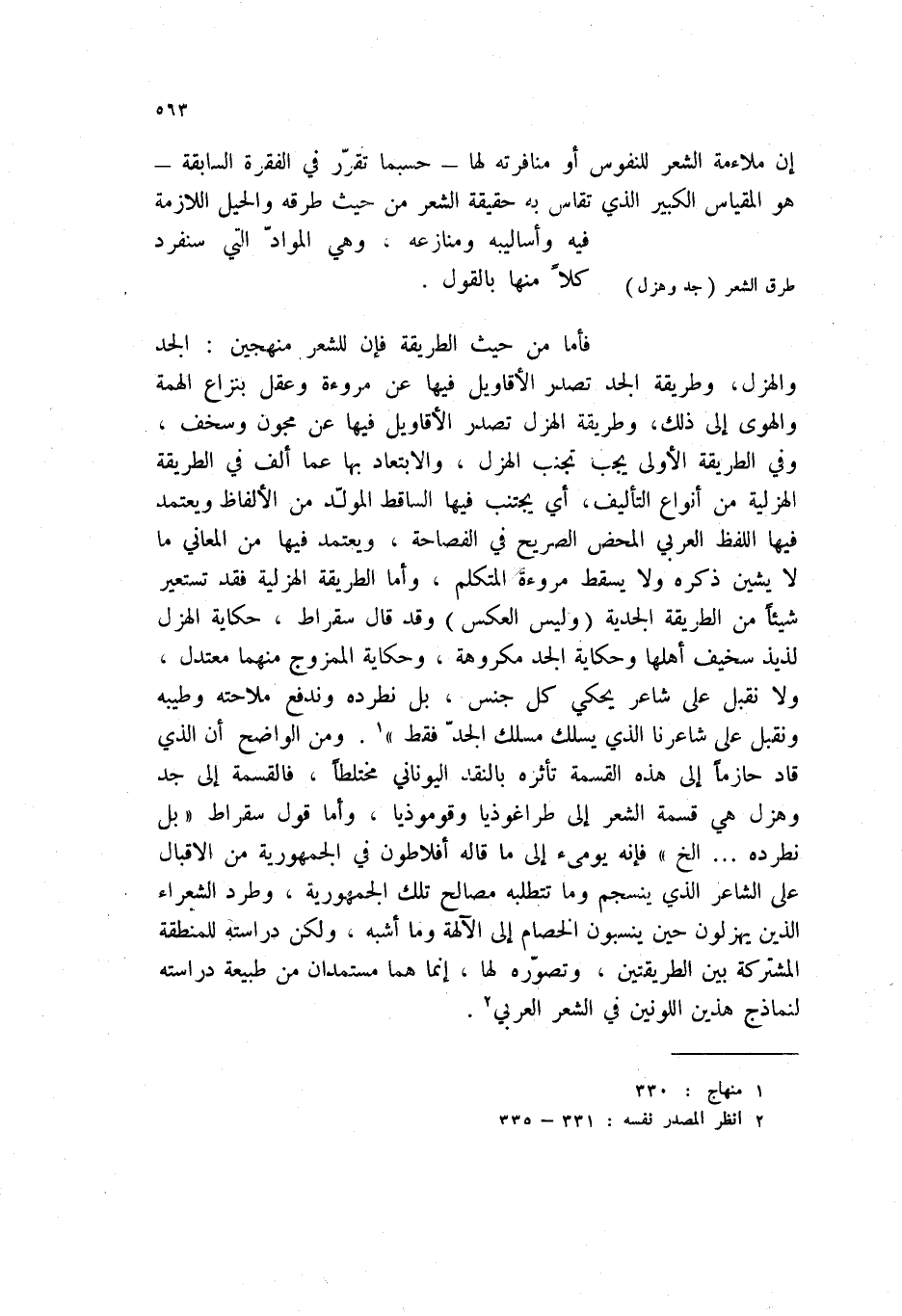 فأما من حيث الطريقة فإن للشعر منهجين: الجد والهزل، وطريقة الجد تصدر الأقاويل فيها عن مروءة وعقل بنزاع الهمة والهوى إلى ذلك، وطريقة الهزل تصدر الأقاويل فيها عن مجون وسخف، وفي الطريقة الأولى يجب تجنب الهزل، والابتعاد بها عما ألف في الطريقة الهوزلية من أنواع التاليف، أي يجتنب فيها الساقط المولد من الألفاظ ويعتمد فيها اللفظ العربي المحض الصريح في الفصاحة، ويعتمد فيها من المعاني ما لا يشين ذكره ولا يسقط مروءة المتكلم، وأما الطريقة الهزلية فقد تستعير شيئاً من الطريقة الجدية (وليس العكس) وقد قال سقراط، حكاية الهزل لذيذ سخيف أهلها وحكاية الجد مكروهة، وحكاية الممزوج منهما معتدل، ولا نقبل على شاعر يحكي كل جنس، بل نطرده وندفع ملاحته وطيبه ونقبل على شاعرنا الذي يسلك مسلك الجد فقط " (1) . ومن الواضح أن الذي قاد حازماً إلى هذه القسمة تأثره بالنقد اليوناني مختلطاً، فالقسمة إلى جد وهزل هي قسمة الشعر إلى طراغوذيا وقوموذيا، وأما قول سقراط " بل نطرده؟ الخ " فإنه يومئ إلى ما قاله أفلاطون في الجمهورية من الإقبال على الشاعر الذي ينسجم وما تتطلبه مصالح تلك الجمهورية، وطرد الشعراء الذين يهزلون حين ينسبون الخصام إلى الآلهة وما أشبه، ولكن دراسته للمنطقة المشركة بين الطريقتين، وتصوره لها، إنما هما مستمدان من طبيعة دراسته لنماذج هذين اللونين في الشعر العربي (2) .