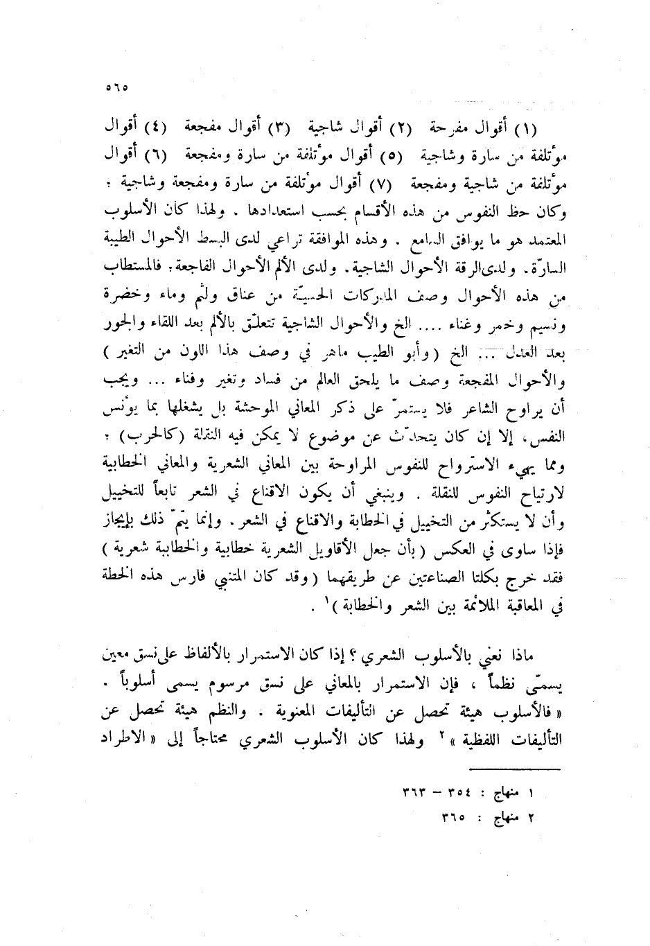 (1) أقوال مفرحة (2) أقوال شاجية (3) أقوال مفجعة (4) أقوال مؤتلفة من سارة وشاجية (5) أقوال مؤتلفة من سارة ومفجعة (6) أقوال مؤتلفة من شاجية ومفجعة (7) أقوال مؤتلفة من سارة ومفجعة وشاجية؛ وكان حظ النفوس من هذه الأقسام بحسب استعدادها، ولهذا كان الأسلوب المعتمد هو ما يوافق السامع، وهذه الموافقة تراعي لدى البسيط الأحوال الطيبة السارة، ولدى الرقة الأحوال الشاجية، ولدى الألم الأحوال الفاجعة؛ فالمستطاب من هذه الأحوال وصف المدركات الحسية من عناق ولثم وماء وخضرة ونسيم وخمر وغناء؟. الخ والأحوال الشاجية تتعلق بالألم بعد اللقاء والجور بعد العدل؟ الخ (وأبو الطيب ماهر في وصف هذا اللون من التغير) والأحوال المفجعة وصف ما يلحق العالم من فساد وتغير وفناء؟ ويجب أن يراوح الشاعر ففلا يستمر على ذكر المعاني الموحشة بل يشغلها بما يؤنس النفس، إلا أن كان يتحدث عن موضوع لا يمكن فيه النقلة (كالحرب) ؛ ومما يهيئ الاسترواح للنفوس المراوحة بين المعاني الشعرية والمعاني الخطابية لارتياح النفوس للنقلة، وينبغي ان يكون الإقناع في الشعر تابعاً للتخييل وان لا يستكثر من التخييل في الخطابة والإقناع في الشعر، وإنما يتم ذلك بإيجاز فإذا ساوى في العكس (بان جعل الأقاويل الشعرية خطابية والخطابية شعرية) فقد خرج بكلتا الصناعتين عن طريقهما (وقد كان المتنبي فارس هذه الخطة في المعاقبة الملائمة بين الشعر والخطابة) (1) .