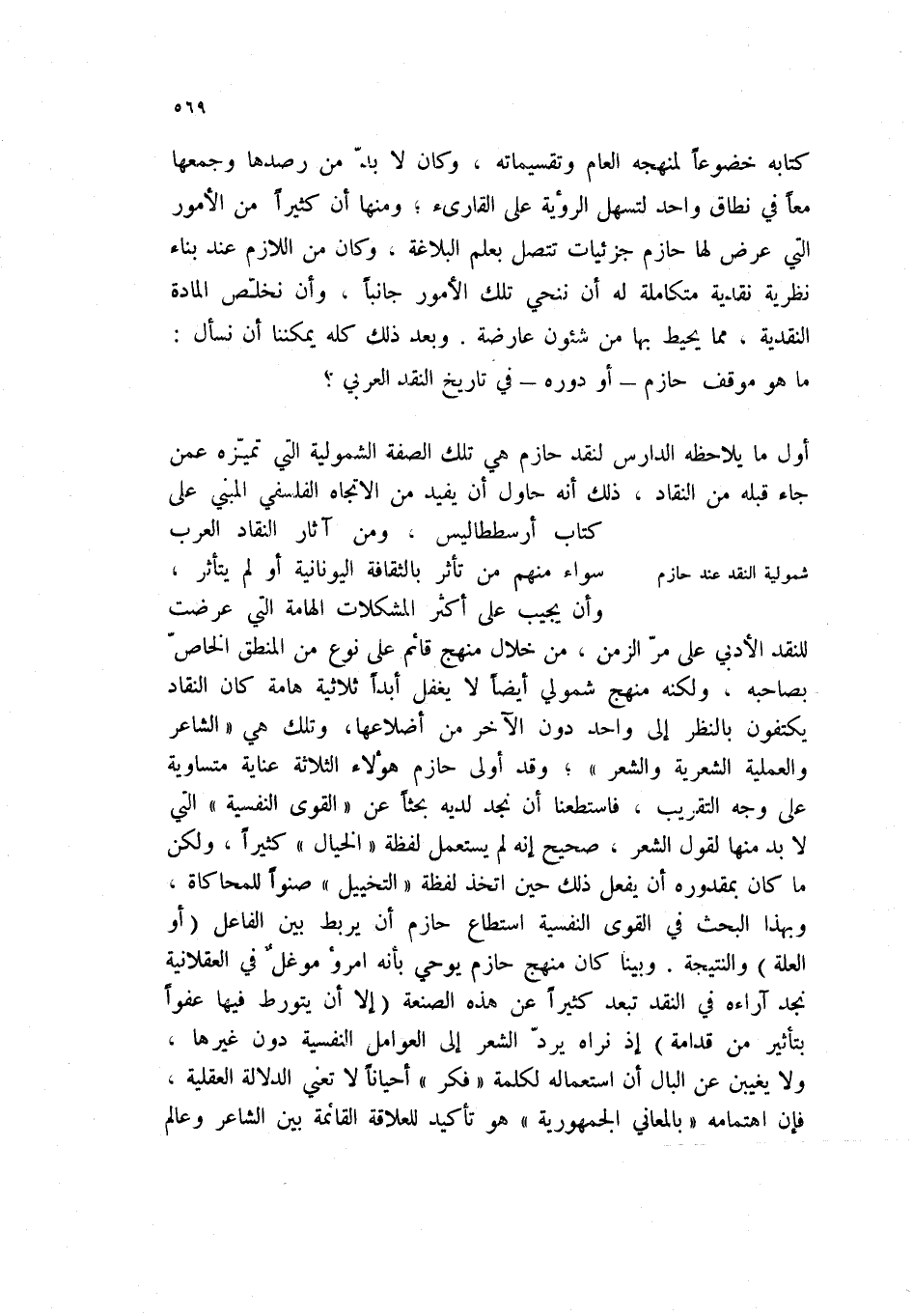 كتابه خضوعاً لمنهجه العام وتقسيماته، وكان لابد من رصدها وجمعها معاً في نطاق واحد لسهل الرؤية على القارئ؛ ومنها أن كثيراً من الأمور التي عرض لها حازم جزئيات تتصل بعلم البلاغة، وكان من اللازم عند بناء نظرية نقدية متكاملة له أن ننحي تلك الأمور جانباً. وان نخلص المادة النقدية، مما يحيط بها من شئون عارضة. وبعد ذلك كله يمكننا أن نسأل: ما هو موقف حازم - أو دوره - في تاريخ النقد العربي؟