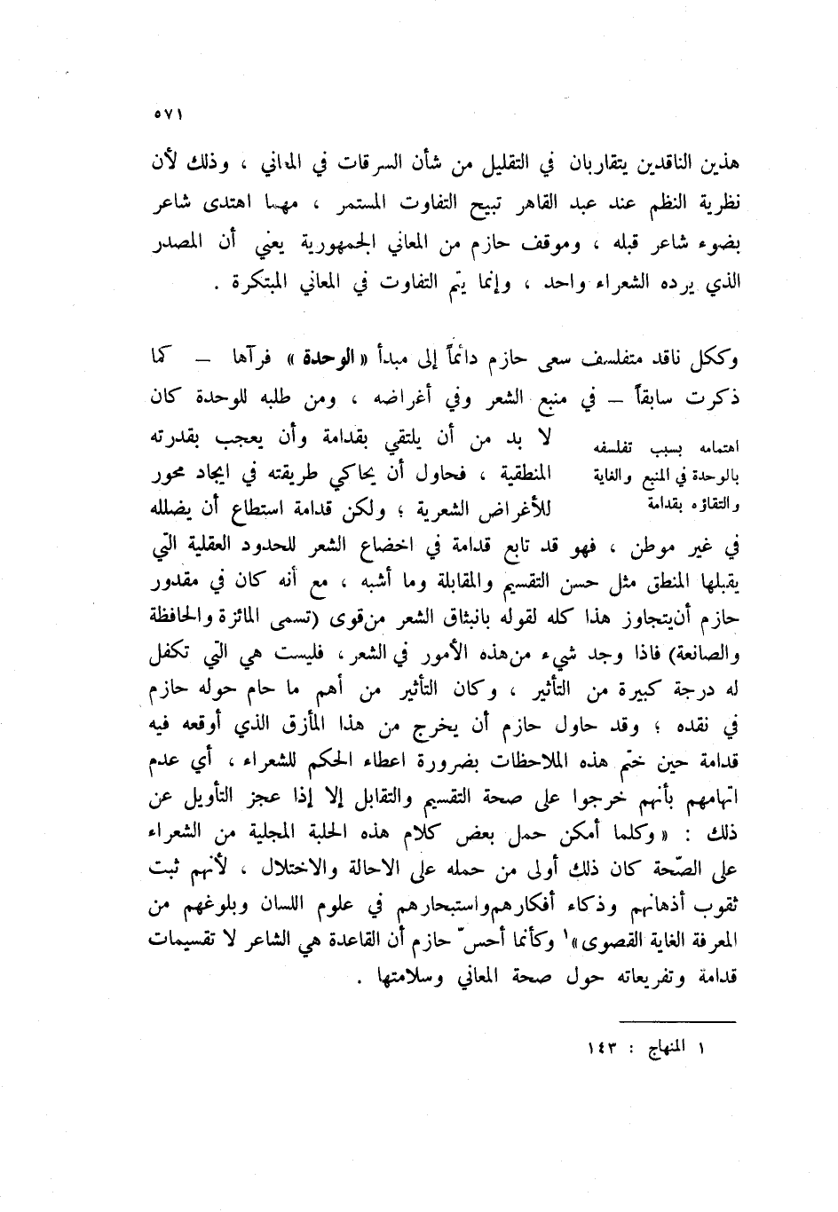 وككل ناقد متفلسف سعى حازم دائماً إلى مبدأ " الوحدة " فرآها - كما ذكرت سابقاً - في منبع الشعر وفي أغراضه، ومن طلبه للوحدة كان لابد من أن يلتقي بقدامة وان يعجب بقدرته المنطقية، فحاول ان يحاكي طريقته في إيجاد محور للأغراض الشعرية؛ ولكن قدامة استطاع أن يضلله في غير موطن، فهو قد تابع قدامة في إخضاع الشعر للحدود العقلية التي يقبلها المنطق مثل حسن التقسيم والمقابلة وما أشبه، مع انه كان في مقدور حازم ان يتجاوز هذا كله لقوله بانبثاق الشعر من قوى " تسمى المائزة والحافظة والصانعة) فإذا وجد شيء من هذه الأمور في الشعر؛ فليست هي التي تكفل له درجة كبيرة من التأثير، وكان التأثير من أهم ما حام حوله حازم في نقده؛ وقد حاول حازم ان يخرج من هذا المأزق الذي أوقعه فيه قدامة حين ختم هذه الملاحظات بضرورة إعطاء الحكم للشعراء، أي عدم اتهامهم بأنهم خرجوا على صحة التقسيم والتقابل إلا إذا عجز التأويل عن ذلك: " وكلما أمكن حمل بعض كلام هذه الحلبة المجلية من الشعراء على الصحة كان ذلك أولى من حمله على الإحالة والاختلال، لأنهم ثبت ثقوب أذهانهم وذكاء أفكارهم واستبحارهم في علوم اللسان وبلوغهم من المعرفة الغاية القصوى " (1) وكأنما أحس حازم أن القاعدة هي الشاعر لا تقسيمات قدامة وتفريعاته حول صحة المعاني وسلامتها.