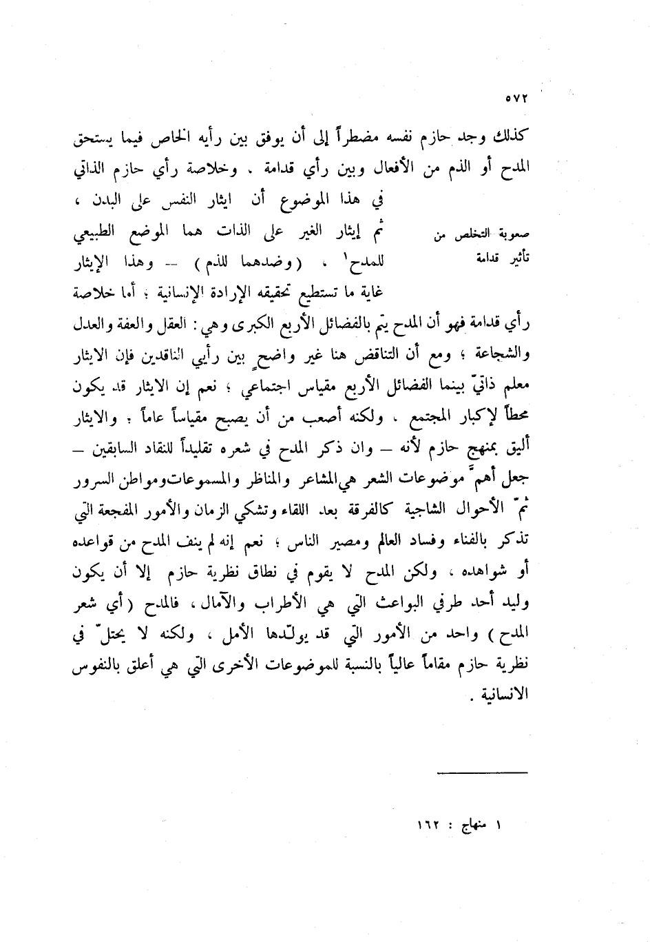 كذلك وجد حازم نفسه مضطراً إلى أن يوفق بين رأيه الخاص فيما يستحق المدح أو الذم من الأفعال وبين رأي قدامة، وخلاصة رأي حازم الذاتي في هذا الموضوع أن إيثار النفس على البدن، ثم إيثار الغير على الذات هما الموضع الطبيعي للمدح (1) ، (وضدهما للذم) - وهذا الإيثار غاية ما تستطيع تحقيقه الإرادة الإنسانية؛ أما خلاصة رأي قدامة فهو أن المدح يتم بالفضائل الأربع الكبرى وهي: العقل والعفة والعدل والشجاعة؛ ومع أن التناقض هنا غير واضح بين رأيي الناقدين فإن الإيثار معلم ذاتي بينما الفضائل الأربع مقياس اجتماعي؛ نعم ان الإيثار قد يكون محطاً لإكبار المجتمع، ولكنه أصعب من ان يصبح مقياساً عاماً؛ والإيثار أليق بمنهج حازم لأنه - وان ذكر المدح في شعره تقليداً للنقاد السابين - جعل أهم موضوعات الشعر هي المشاعر والمناظر والمسموعات ومواطن السرور ثم الأحوال الشاجية كالفرقة بعد اللقاء وتشكي الزمان والأمور المفجعة التي تذكر بالفناء وفساد العالم ومصير الناس؛ نعم إنه لم ينف المدح من قواعده أو شواهده، ولكن المدح لا يقوم في نطاق نظرية حازم إلا ان يكون وليد أحد طرفي البواعث التي هي الإطراب والآمال، فالمدح (أي شعر المدح) واحد من الأمور التي قد يولدها الأمل، ولكنه لا يحتل في نظرية حازم مقاماً عالياً بالنسبة للموضوعات الأخرى التي هي أعلق بالنفوس الإنسانية.