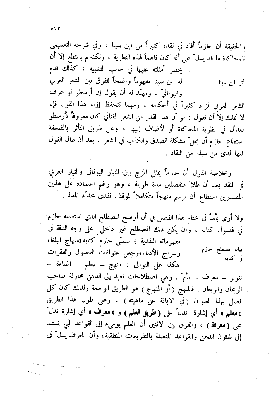 ولا أرى باساً في ختام هذا الفصل في أن أوضح المصطلح الذي استعمله حازم في فصول كتابه، وان يكن ذلك المصطلح غير داخل على وجه الدقة في مفرماته النقدية؛ سمى حازم كتابه " منهاج البلغاء وسراج الأدباء " وجعل عنوانات الفصول والفقرات هكذا على التوالي: منهج - معلم - إضاءة - تنوير - معرف - مام. وهي اصطلاحيات تعيد إلى الذهن محاولة صاحب الريحان والريعان. فالمنهج (أو المنهاج) هو الطريق الواسعة ولذلك كان كل فصل بهذا العنوان (في الإبانة عن ماهيته) ، وعلى طول هذا الطريق " معلم " أي إشارة تدل على (طريق العلم) و " معرف " أي إشارة تدل إلى شئون الذهن والقواعد المتصلة بالتفريعات المنطقية، وان المعرف يدل في