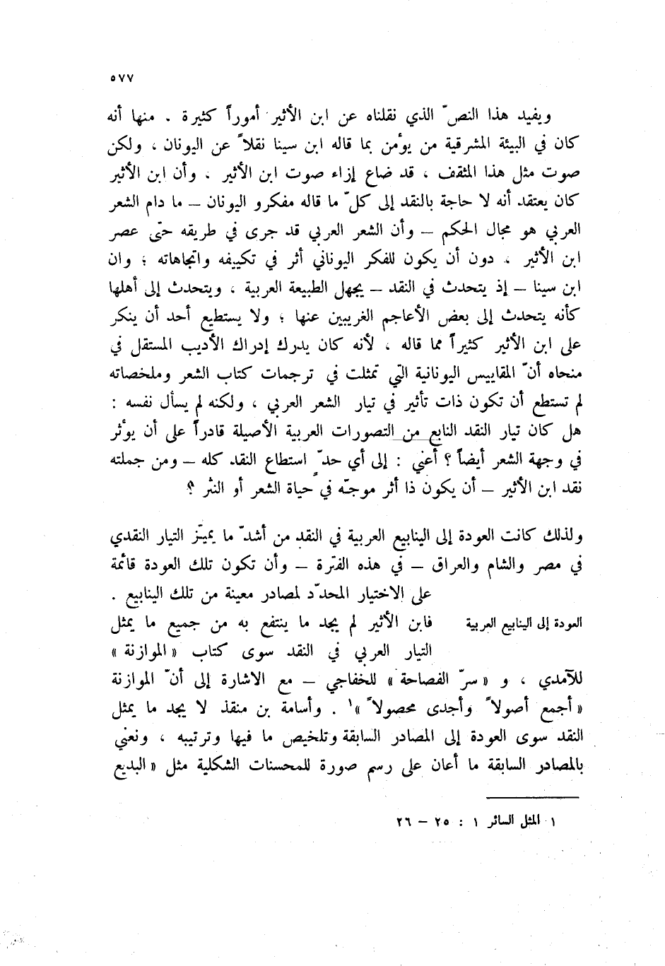 ويفيد هذا النص الذي نقلناه عن ابن الأثير أموراً كثيرة، منها أنه كان في البيئة المشرقية من يؤمن بما قاله ابن سينا نقلاً عن اليونان، ولكن صوت مثل هذا المثقف، قد ضاع إزاء صوت ابن الأثير، وأن ابن الأثير كان يعتقد أنه لا حاجة بالنقد إلى كل ما قاله مفكرو اليونان - ما دام الشعر العربي هو مجال الحكم - وان الشعر العربي قد جرى في طريقه حتى عصر ابن الأثير، دون ان يكون للفكر اليوناني أثر في تكييفه واتجاهاته؛ وان ابن سينا - إذ يتحدث في النقد - يجهل الطبيعة العربية، ويتحدث إلى أهلها كأنه يتحدث إلى بعض الاعاجيم الغربيين عنها؛ ولا يستطيع أحد أن ينكر على ابن الأثير كثيراً مما قاله، لأنه كان يدرك إدراك الأديب المستقل في منحاه أن المقاييس اليونانية التي تمثلت في ترجمات كتاب الشعر وملخصاته لم تستطع أن تكون ذات تأثير في تيار الشعر العربي، ولكنه لم يسال نفسه: هل كان تيار النقد النابع من التصورات العربية الأصيلة قادراً على أن يؤثر في وجهة الشعر أيضاً؟ أعني: إلى أي حد استطاع النقد كله - ومن جملته نقد ابن الأثير - أن يكون ذا أثر موجه في حياة الشعر أو النثر؟