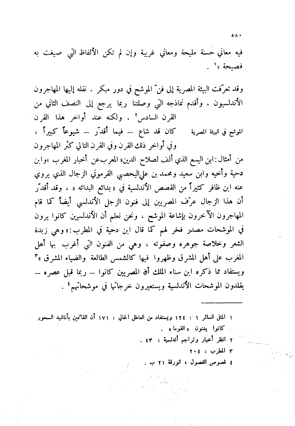 وقد تعرفت البيئة المصرية إلى فن الموشح في دور مبكر، نقله إليها المهاجرون الأندلسيون، وأقدم نماذجه التي وصلتنا ربما يرجع إلى النصف الثاني من القرن السادس (2) ، ولكنه عند أواخر هذا القرن كان قد شاع - فيما اقدر - شيوعاً كبيراً، وفي أواخر ذلك القرن وفي القرن الآلي كثر المهاجرون من أمثال: ابن اليسع الذي ألف لصلاح الدين " المعرب عن أخبار المغرب " وابن دحية وأخيه وابن سعيد ومحمد بن علي اليحصبي القرموني الزجال الذي يروي عنه ابن ظافر كثيراً من القصص الأندلسية في " بدائع البدائه "، وقد اقدر أن هذا الزجال عرف المصريين إلى فنون الزجل الأندلسي أيضاً كما قام المهاجرون الآخرون بإشاعة الموشح، ونحن نعلم أن الأندلسيين كانوا يرون في الموشحات مصدر فخر لهم كما قال ابن دحية في المطرب: " وهي زبدة الشعر وخلاصة جوهره وصفوته، وهي من الفنون التي اغرب بها أهل المغرب على أهل المشرق وظهروا فيها كالشمس الطالعة والضياء المشرق " (3) ويستفاد مما ذكره ابن سناء الملك ان المصريين كانوا - ربما قبل عصره - يقلدون الموشحات الأندلسية ويستعيرون خرجاتها في موشحاتهم (4) .