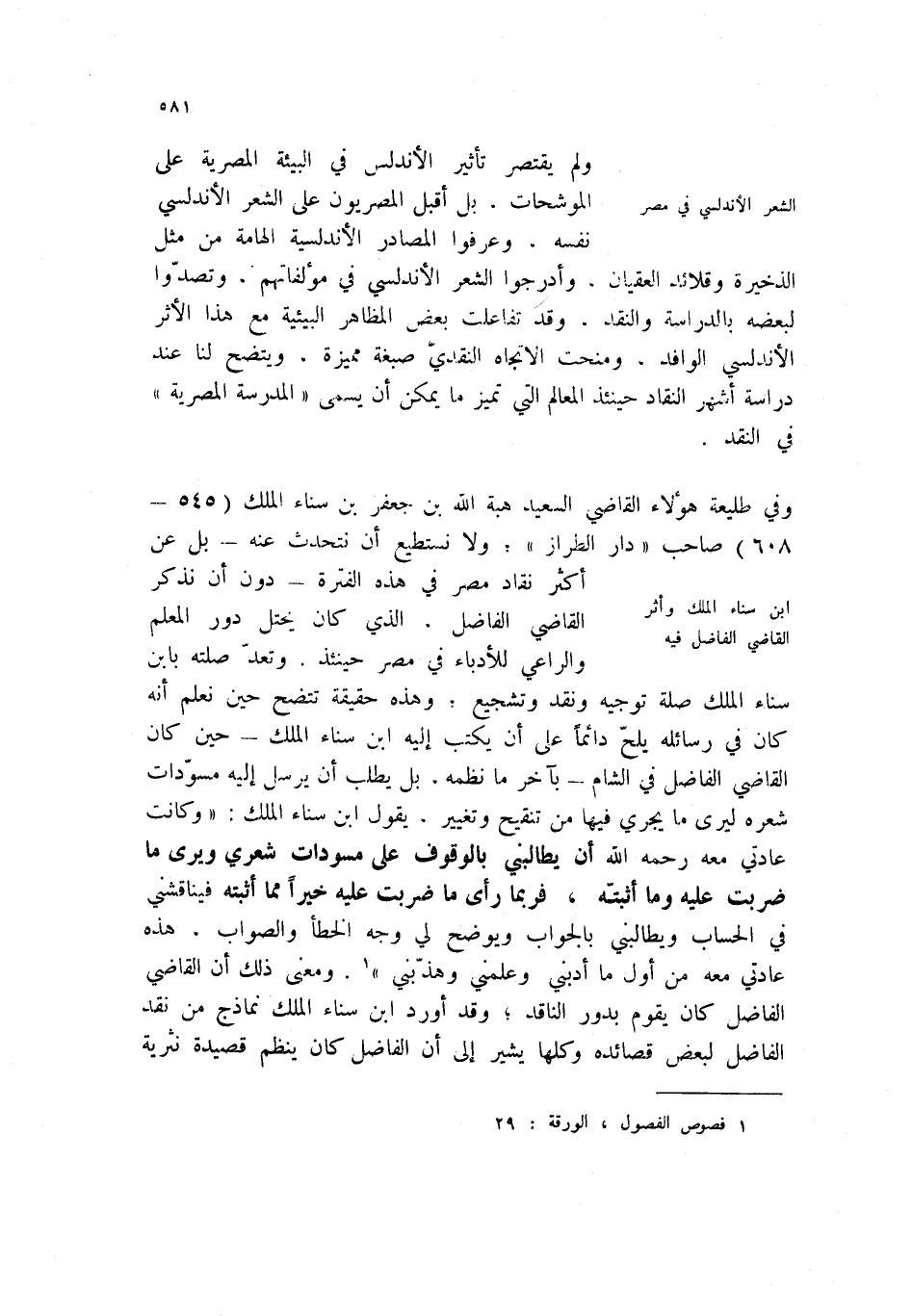 وفي طليعة هؤلاء القاضي السعيد هبة الله بن جعفر بن سناء الملك (545 - 608) صاحب " دار الطراز "؛ ولا نستطيع أن نتحدث عنه - بل عن أكثر نقاد مصر في هذه الفترة - دون أن نذكر القاضي الفاضل، الذي كان يحتل دور المعلم والراعي للأدباء في مصر حينئذ، وتعد صلته بابن سناء الملك صلة توجيه ونقد وتشجيع؛ وهذه حقيقة تتضح حين نعلم انه كان في رسائله يلح دائماً على أن يكتب إليه ابن سناء الملك - حين كان القاضي الفاضل في الشام - بآخر ما نظمه، بل يطلب أن يرسل إليه مسودات شعره ليرى ما يجري فيها من تنقيح وتغيير. يقول ابن سناء الملك: " وكانت عادتي معه رحمه الله أن يطالبني بالوقوف على مستودات شعري ويرى ما ضربت عليه وما أثبته، فربما رأي ما ضربت عليه خيراً مما أثبته فيناقشني في الحساب ويطالبني بالجواب ويوضح لي وجه الخطأ والصواب، هذه عادتي معه من أول ما أدبني وعلمني وهذبني " (1) . ومعنى ذلك أن القاضي الفاضل كان يقوم بدور الناقد؛ وقد أورد ابن سناء الملك نماذج من نقد الفاضل لبعض قصائده وكلها يشير إلى أن الفاضل كان ينظم قصيدة نثرية