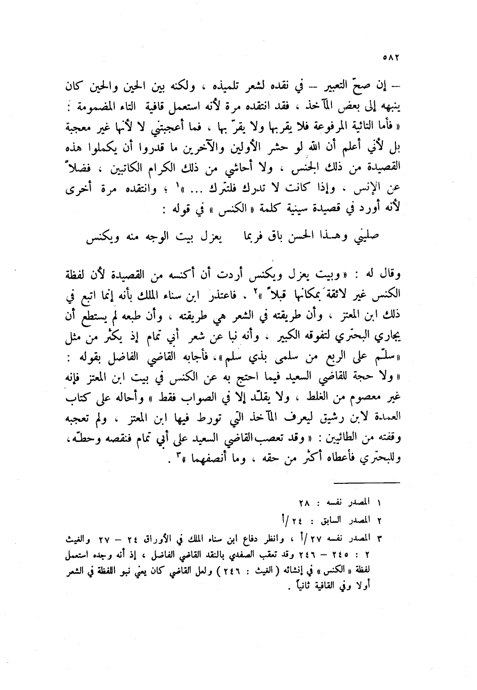 صليني وهذا الحسن باق فربما ... يعزل بيت الوجه منه ويكنس وقال له: " وبيت يعزل ويكنس أردت أن أكنسه من القصيدة لان لفظة الكنس غير لائقة بمكانها قبلاً " (2) ، فاعتذر ابن سناء الملك بأنه إنما اتبع في ذلك ابن المعتز، وان طريقته في الشعر هي طريقته، وأن طبعه لم يستطع أن يجاري البحتري لتفوقه الكبير، وانه نبا عن شعر أبي تمام إذ يكثر من مثل " سلم على الربع من سلمى بذي سلم "، فأجابه القاضي الفاضل بقوله: " ولا حجة للقاضي السعيد فيما أحتج به في الصواب فقط " وأحاله على كتاب العمدة لابن رشيق ليعرف المآخذ التي تورط فيها ابن المعتز، ولم تعجبه وقفته من الطائيين: " وقد تعصب القاضي السعيد على أبي تمام فنقصه وحطه، وللبحري فأعطاه أكثر من حقه، وما أنصفهما " (3) .