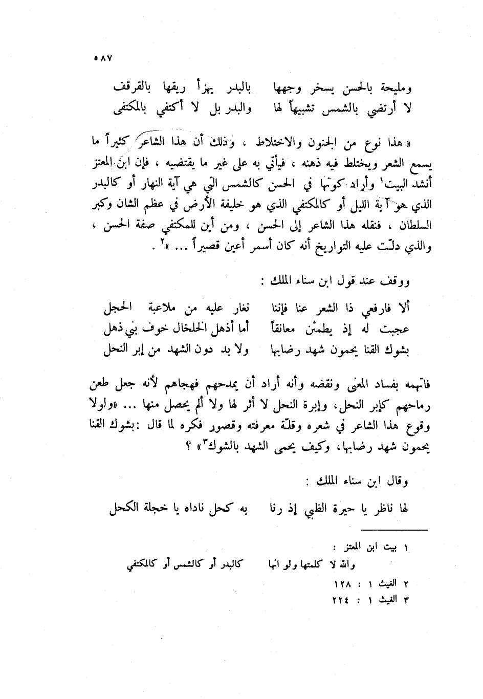 لا أرتضي بالشمس تشبيهاً لها ... والبدر بل أكتفي بالمكتفي " وهذا نوع من الجنون والاختلاط، وذلك أن هذا الشاعر كثيراً ما يسمع الشعر ويختلط فيه ذهنه، فيأتي به على غير ما يقتضيه، فإن ابن المعتز انشد البيت (1) وأراد كونها في الحسن كالشمس التي هي آية النهار أو كالبدر الذي هو آية الليل أو كالمكتفي الذي هو خليفة الأرض في عظم الشان وكبر السلطان، فنقله هذا الشاعر إلى الحسن، ومن أين للمكتفي صفة الحسن، والذي دلت عليه التواريخ أنه كان أسمر أعين قصيراً؟ " (2) .