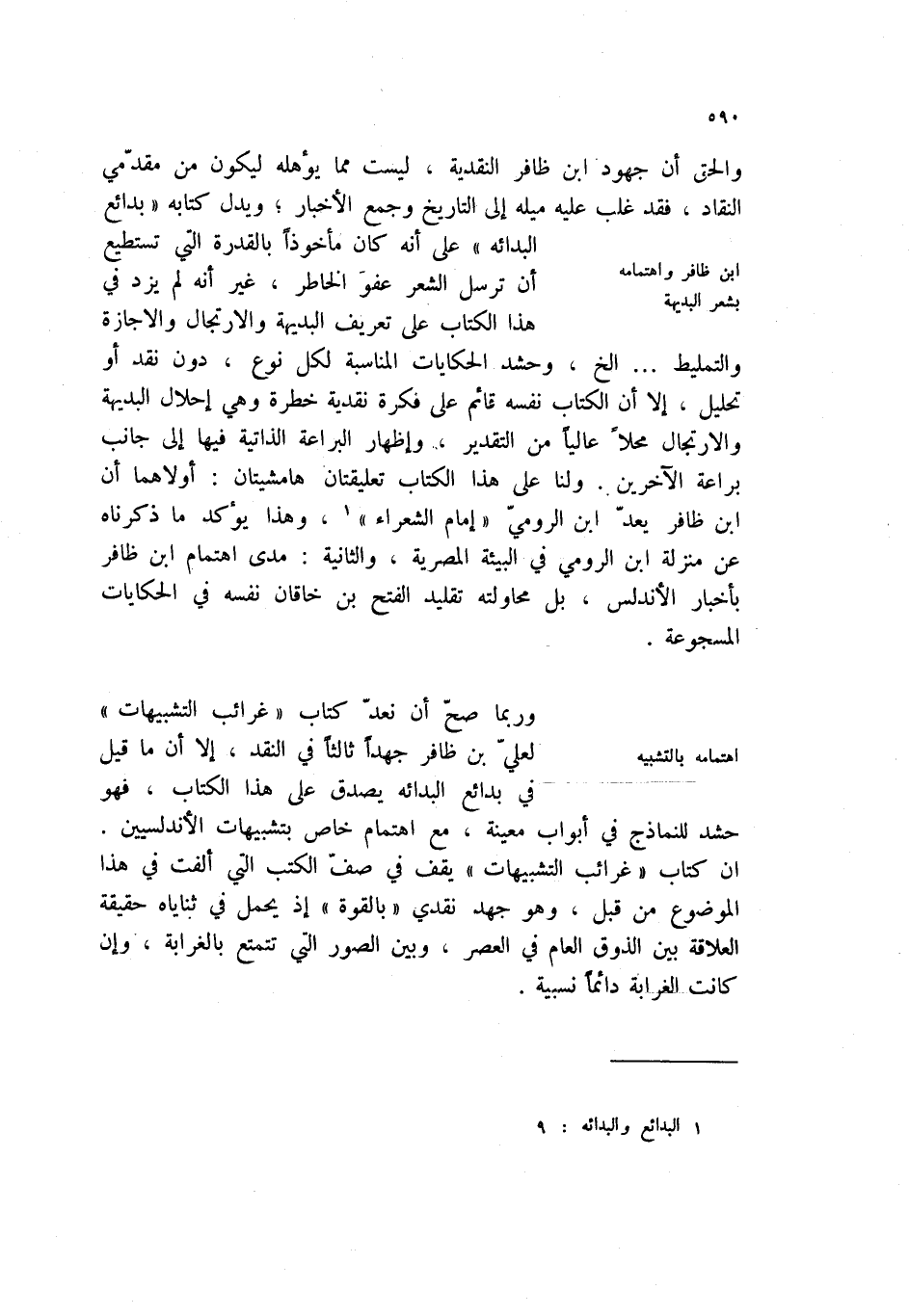 والحق أن جهود ابن ظافر النقدية، ليست مما يؤهله ليكون من مقدمي النقاد، فقد غلب عليه ميله إلى التاريخ وجمع الأخبار، ويدل كتابه " بدائع البدائه " على أنه كان مأخوذاً بالقدرة التي تستطيع أن ترسل الشعر عفو الخاطر، غير أنه لم يزد في هذا الكتاب على تعريف البديهة والارتجال والإجازة والتمليط؟ الخ، وحشد الحكايات المناسبة لكل نوع، دون نقد أو تحليل، إلا أن الكتاب نفسه قائم على فكرة نقدية خطرة وهي إحلال البديهة والارتجال محلاً عالياً في التقدير، وإظهار البراعة الذاتية فيها إلى جانب براعة الآخرين. ولنا على هذا الكتاب تعليقتان هامشيتان: أولاهما أن ابن ظافر يعد ابن الرومي " إمام الشعراء " (1) ، وهذا يؤكد ما ذكرناه عن منزلة ابن الرومي في البيئة المصرية، والثانية: مدى اهتمام ابن ظافر بأخبار الأندلس، بل محاولته تقليد الفتح بن خاقان نفسه في الحكايات المسجوعة.