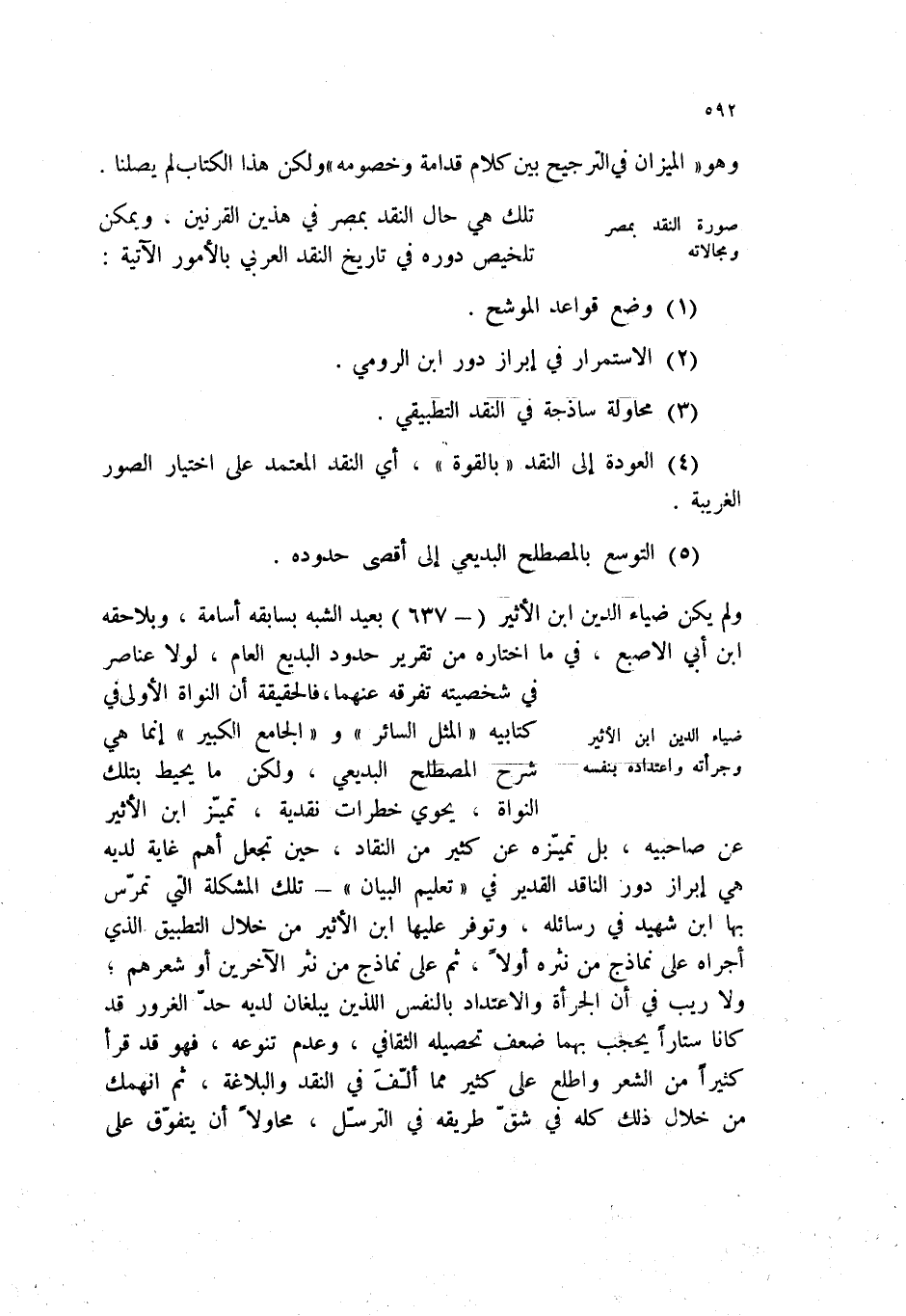 ولم يكن ضياء الدين ابن الأثير (- 637) بعيد الشبه بسابقه أسامة، وبلاحقه ابن أبي الاصبع، في ما اختاره من تقرير حدود البديع العام، لولا عناصر في شخصيته تفرقه عنهما، فالحقيقة أن النواة الأولى في كتابيه " المثل السائر " و " الجامع الكبير " إنما هي شرح المصطلح البديعي، ولكن ما يحيط بتلك النواة، يحوي خطرات نقدية، تميز ابن الأثير عن صاحبيه، بل تميزه عن كثير من النقاد، حين تجعل أهم غاية لديه هي إبراز دور الناقد القدير في " تعليم البيان " - تلك المشكلة التي تمرس بها ابن شهيد في رسائله، وتوفر عليها ابن الأثير من خلال التطبيق الذي أجراه على نماذج من نثره أولاً، ثم على نماذج من نثر الآخرين او شعرهم؛ ولا ريب في أن الجرأة والاعتداد بالنفس اللذين يبلغان لديه حد الغرور قد كانا ستاراً يحجب بهما ضعف تحصيله الثقافي، وعدم تنوعه، فهو قد قرا كثيراً من الشعر واطلع على كثير مما ألف في النقد والبلاغة، ثم انهمك من خلال ذلك كله في شق طريقه في الترسل، محاولاً ان يتفوق على