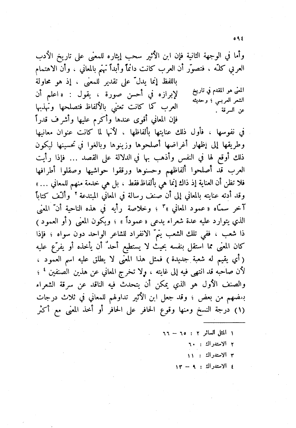 وأما في الوجهة الثانية فإن ابن الأثير سحب إيثاره للمعنى على تاريخ الأدب العربي كله، فتصور أن العرب كانت دائماً وأبداً تهتم بالمعاني، وان الاهتمام باللفظ إنما يدل على تقدير للمعنى، إذ هو محاولة لإبرازه في احسن صورة، يقول: " اعلم أن العرب كما كانت تعتني بالألفاظ فتصلحها وتهذبها فإن المعاني أقوى عندها وأكرم عليها وأشرف قدراً في نفوسها، فأول ذلك عنايتها بألفاظها، لأنها لما كانت عنوان معانيها وطريقها إلى إظهار أغراضها أصلحوها وزينوها وبالغوا في تحسينها ليكون ذلك أوقع لها في النفس واذهب بها في الدلالة على القصد؟ فإذا رأيت العرب قد أصلحوا ألفاظهم وحسنوها ورققوا حواشيها وصقلوها أطرافها فلا تظن أن العناية إذ ذاك إنما هي بألفاظ فقط، بل هي خدمة منهم للمعاني؟ " (1) وقد أدته عنايته بالمعاني إلى أن صنف رسالة في المعاني المبتدعة (2) وألف كتاباً آخر سماه " عمود المعاني " (3) ؛ وخلاصة رأيه في هذه الناحية أن المعنى الذي يتوارد عليه عدة شعراء يدعى " عموداً "؛ ويكون المعنى (أو العمود) ذا شعب، ففي تلك الشعب يتم الانفراد للشاعر الواحد دون سواه؛ فإذا كان المعنى مما استقل بنفسه بحيث لا يستطيع أحد ان يأخذه أو يفرع عليه (أي يقيم له شعبة جديدة) فمثل هذا المعنى لا يطلق عليه اسم العمود، لان صاحبه قد انتهى فيه إلى غايته، ولا تخرج المعاني عن هذين الصنفين (4) ؛ والصنف الأول هو الذي يمكن ان يتحدث فيه الناقد عن سرقة الشعراء بعضهم من بعض؛ وقد جعل ابن الأثير تداولهم للمعاني في ثلاث درجات (1) درجة النسخ ومنها وقوع الحافر أو أخذ المعنى مع أكثر