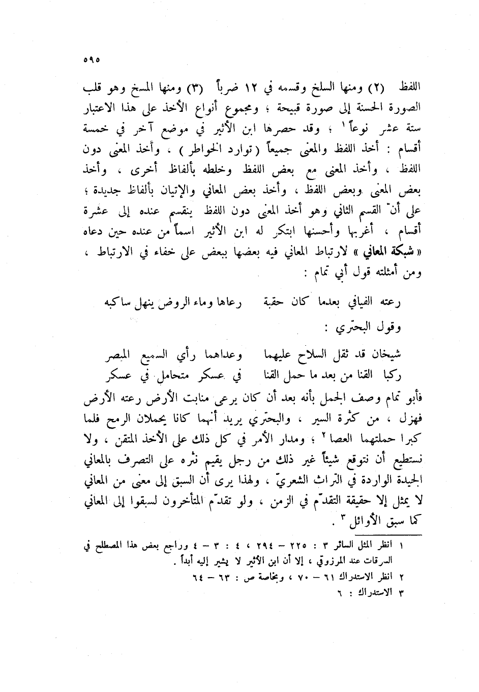 (1) أنظر المثل السائر 3: 225 - 294، 4: 3 - 4 وراجع بعض هذا المصطلح في السرقات عند المرزوقي، إلا ان ابن الأثير لا يشير إليه أبداً.
