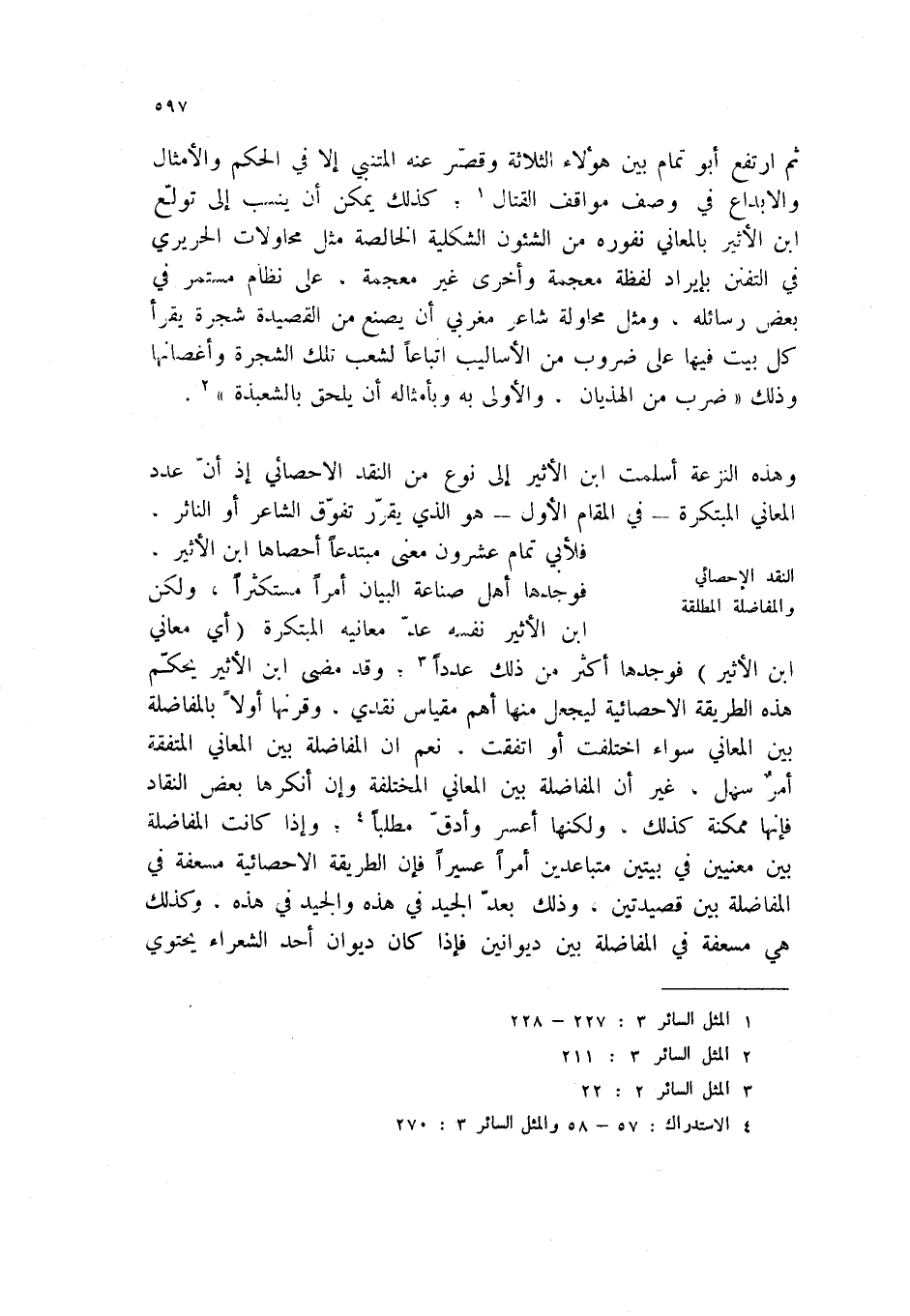 وهذه النزعة أسلمت ابن الأثير إلى نوع من النقد الإحصائي إذ أن عدد المعاني المبتكرة - في المقام الأول - هو الذي يقرر تفوق الشاعر أو الناثر. فلأبي تمام عشرون معنى مبتدعاً أحصاها ابن الأثير، فوجدها أهل صناعة البيان أمراً مستكثراً، ولكن ابن الأثير نفسه عد معانيه المبتكرة (أي معاني ابن الأثير) فوجدها أكثر من ذلك عدداً (3) ؛ وقد مضى ابن الأثير يحكم هذه الطريقة الإحصائية ليجعل منها أهم مقياس نقدي، وقرنها أولاً بالمفاضلة بين المعاني سواء اختلفت أو اتفقت، نعم أن المفاضلة بين المعاني المتفقة أمر سهل، غير أن المفاضلة بين المعاني المختلفة وإن أنكرها بعض النقاد فإنها ممكنة كذلك، ولكنها اعسر وأدق مطلباً (4) ؛ وإذا كانت المفاضلة بين معنيين في بيتين متباعدين أمراً عسيراً فإن الطريقة الإحصائية مسعفة في المفاضلة بين قصيدتين، وذلك بعد الجيد في هذه والجيد في هذه، وكذلك هي مسعفة في المفاضلة بين ديوانين فإذا كان ديوان أحد الشعراء يحتوي