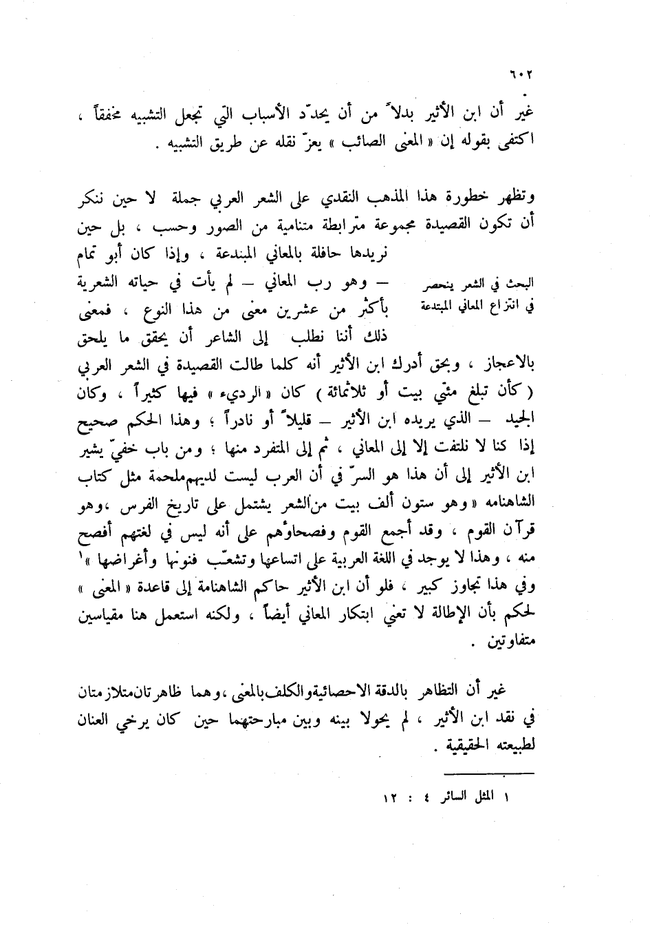 وتظهر خطورة هذا المذهب النقدي على الشعر العربي جملة لا حين ننكر ان تكون القصيدة مجموعة مترابطة متنامية من الصور وحسب، بل حين نريدها حافلة بالمعاني المبتدعة، وإذا كان أبو تمام - وهو رب المعاني - لم يأت في حياته الشعرية بأكثر من عشرين معنى من هذا النوع، فمعنى ذلك أننا نطلب إلى الشاعر ان يحقق ما يلحق بالأعجاز، وبحق أدراك ابن الأثير انه كلما طالت القصيدة في الشعر العربي (كان تبلغ مئتي بيت أو ثلاثمائة) كان " الرديء " فيها كثيراً، وكان الجيد - الذي يريده ابن الأثير - قليلاً أو نادراً؛ وهذا الحكم صحيح إذا كنا لا نلتفت إلا إلى المعاني، ثم إلى المتفرد منها؛ ومن باب خفي يشير ابن الأثير إلى أن هذا هو السر في أن العرب ليست لديهم ملحمة مثل كتاب الشاهنامه " وهو ستون ألف بيت من الشعر يشتمل على تاريخ الفس، وهو قرآن القوم، وقد أجمع القوم وفصحاؤهم على انه ليس في لغتهم أفصح منه، وهذا لا يوجد في اللغة العربية على اتساعها وتشعب فنونها وأغراضها " (1) وفي هذا تجاوز كبير، فلو ان ابن الأثير حاكم الشاهنامة إلى قاعدة " المعنى " لحكم بان الإطالة لا تعني ابتكار المعاني أيضاً، ولكنه استعمل هنا مقياسين متفاوتين.