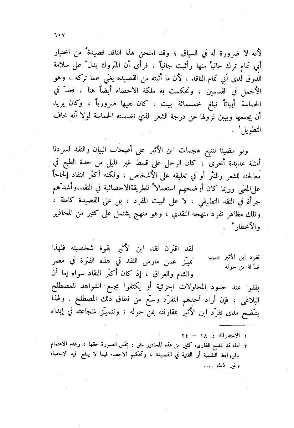 ولو مضينا نتتبع هجمات ابن الأثير على أصحاب البيان والنقد لسردنا أمثلة عديدة أخرى؛ كان الرجل على قسط غير قللي من حدة الطبع في معالجته للشعر والنثر او في تعليقه على الأشخاص، ولكنه اكثر النقاد إلحاحاً على المعنى وربما كان أوضحهم استعمالاً للطريقة الإحصائية في النقد، وأشدهم جرأة في النقد التطبيقي، لا على البيت المفرد، بل على القصيدة كاملة، وتلك تفرد منهجه النقدي، وهو منهج يشتمل على كثير من المحاذير والأخطار (2) .