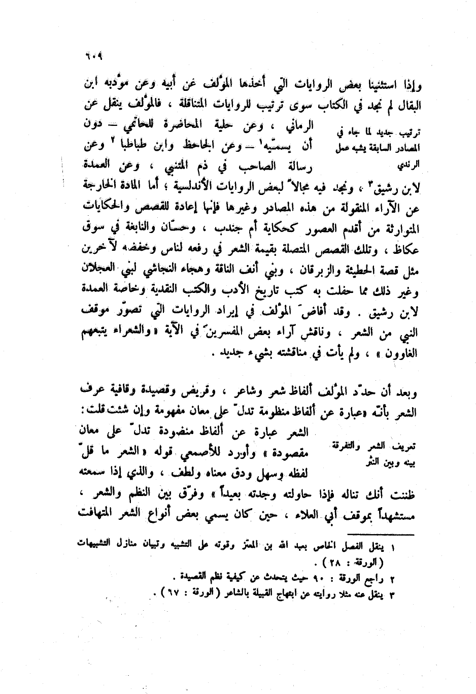 وإذا استثنينا بعض الروايات التي أخذها المؤلف عن أبيه وعن مؤدبه ابن البقال لم نجد في الكتاب سوى ترتيب للروايات المتناقلة، فالمؤلف ينقل عن الرماني، وعن حلية المحاضرة للحاتمي - دون ان يسميه (1) - وعن الجاحظ وابن طباطبا (2) وعن رسالة الصاحب في ذم المتنبي، وعن العمدة لابن رشيق (3) ، ونجد فيه مجالاً لبعض الروايات الأندلسية؛ أما المادة الخارجة عن الآراء المنقولة من هذه المصادر وغيرها فإنها إعادة للقصص والحكايات المتوارثة من أقدم العصور كحكاية أم جندب، وحسان والنابغة في سوق عكاظ، وتلك القصص المتصلة بقيمة الشعر في رفعه لناس وخفضه لآخرين مثل قصة الحطيئة والزبرقان، وبني أنف الناقة وهجاء النجاشي لبني العجلان وغير ذلك مما حفلت به كتب تاريخ الأدب والكتب النقدية وخاصة العمدة النبي من الشعر، وناقش آراء بعض المفسرين في الآية " والشعراء يتبعهم الغاوون "، ولم يأت في مناقشته بشيء جديد.