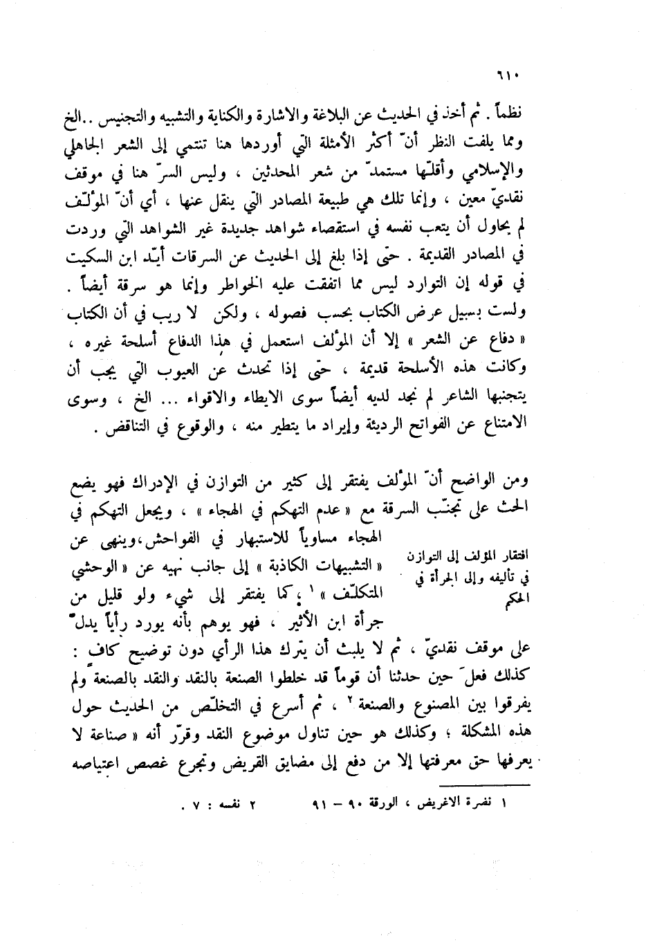 نظماً. ثم اخذ في الحديث عن البلاغة والإشارة والكناية والتشبيه والتجنيس.. الخ ومما يلفت النظر أن أكثر الأمثلة التي أوردها هنا تنتمي إلى الشعر الجاهلي والإسلامي واقلها مستمد من شعر المحدثين، وليس السر هنا في موقف نقدي معين، وإنما تلك هي طبيعة المصادر التي ينقل عنها، أي أن المؤلف لم يحاول أن يتعب نفسه في استقصاء شواهد جديدة غير الشواهد التي وردت في المصادر القديمة. حتى إذا بلغ إلى الحديث عن السرقات أيد ابن السكيت في قوله إن التوارد ليس مما اتفقت عليه الخواطر وغنما هو سرقة أيضاً. وليس بسبيل عرض الكتاب بحسب فصوله، ولكن لا ريب في أن الكتاب " دفاع عن الشعر " إلا ان المؤلف استعمل في هذا الدفاع أسلحة غيره، وكانت هذه الأسلحة قديمة، حتى إذا تحدث عن العيوب التي يجب ان يتجنبها الشاعر لم نجد لديه أيضاً سوى الايطاء والإقواء؟ الخ، وسوى الامتناع عن الفواتح الرديئة وإيراد ما يتطير منه، والوقوع في التناقض.