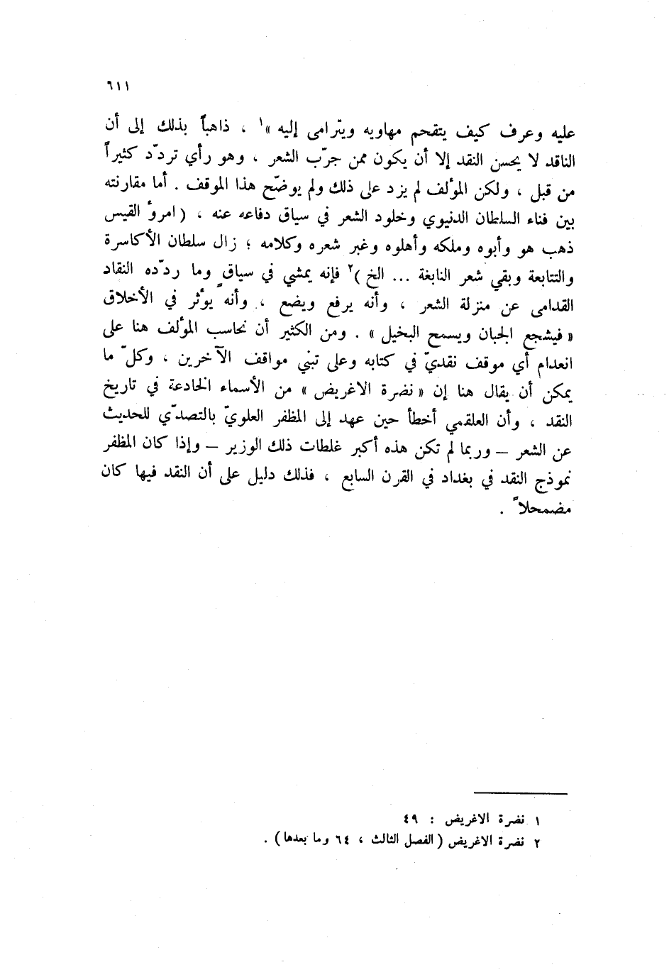 عليه وعرف كيف يتقحم مهاويه ويترامى إليه " (1) . ذاهباً بذلك إلى أن الناقد لا يحسن النقد إلا أن يكون ممن جرب الشعر، وهو رأي تردد كثيراً من قبل، ولكن المؤلف لم يزد على ذلك ولم يوضح هذا الموقف. أما مقارنته بين فناء السلطان الدنيوي وخلود الشعر في سياق دفاعه عنه. (امرؤ القيس ذهب هو وأبوه وملكه وأهلوه وغبر شعره وكلامه؛ زال سلطان الاكاسرة والتتابعة وبقي شعر النابغة.. الخ) (2) فإنه يمشي في سياق وما ردده النقاد القدامى عن منزلة الشعر، وانه يرفع ويضع، وانه يؤثر في الأخلاق " فيشجع الجبان ويسمح البخيل ". ومن الكثير أن نحاسب المؤلف هنا على انعدام أي موقف نقدي في كتابه وعلى تبني مواقف الآخرين، وكل ما يمكن ان يقال هنا إن " نضرة الاغريض " من الأسماء الخادعة في تاريخ النقد، وان العلقمي أخطأ حين عهد إلى المظفر العلوي بالتصدي للحديث عن الشعر - وربما لم تكن هذه أكبر غلطات ذلك الوزير - وإذا كان المظفر نموذج النقد في بغداد في القرن السابع، فذلك دليل على أن النقد فيها كان مضمحلاً.