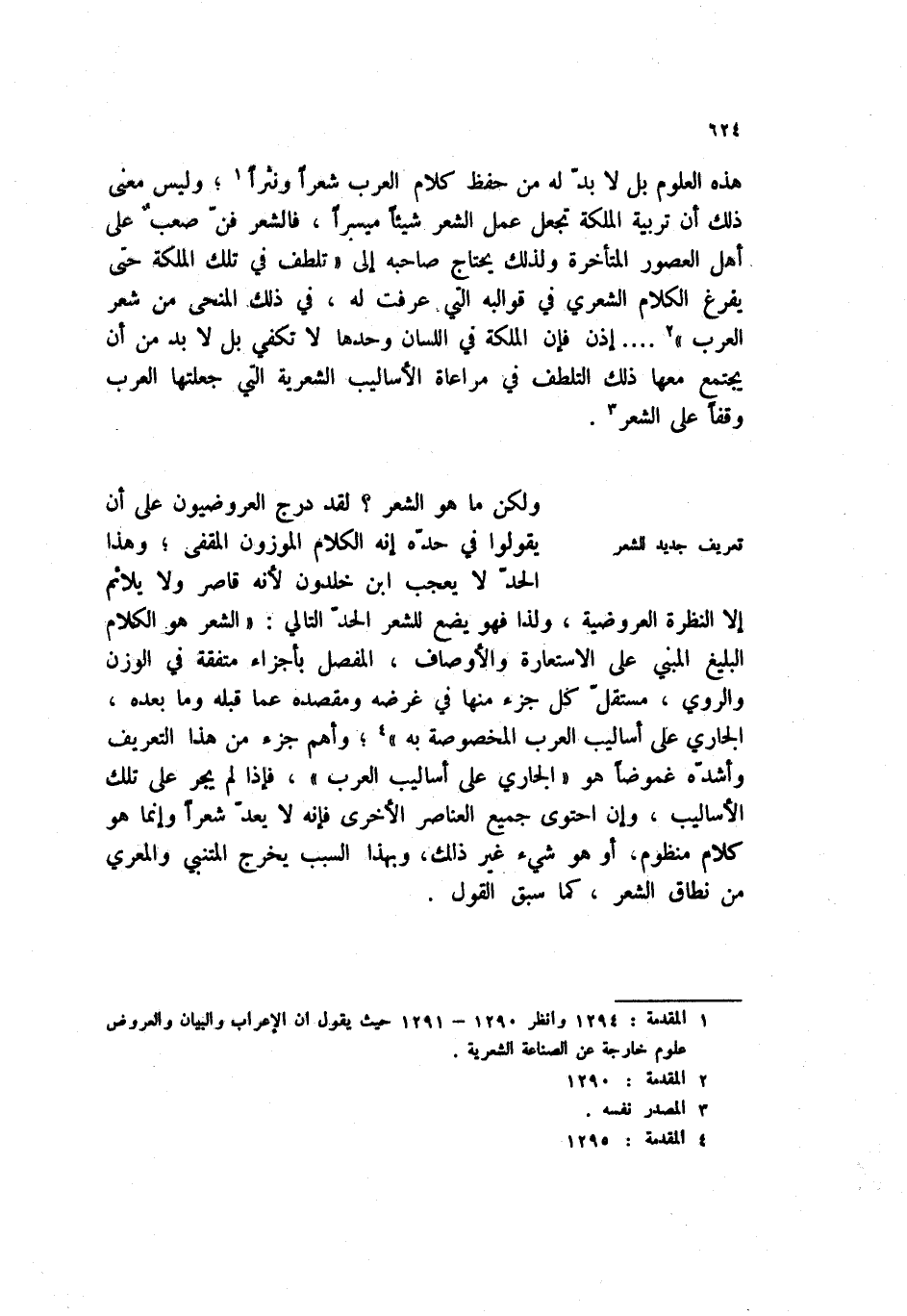 (1) المقدمة: 1294 وانظر 1290 - 1291 حيث يقول أن الإعراب والبيان والعروض علوم خارجة عن الصناعة الشعرية.
