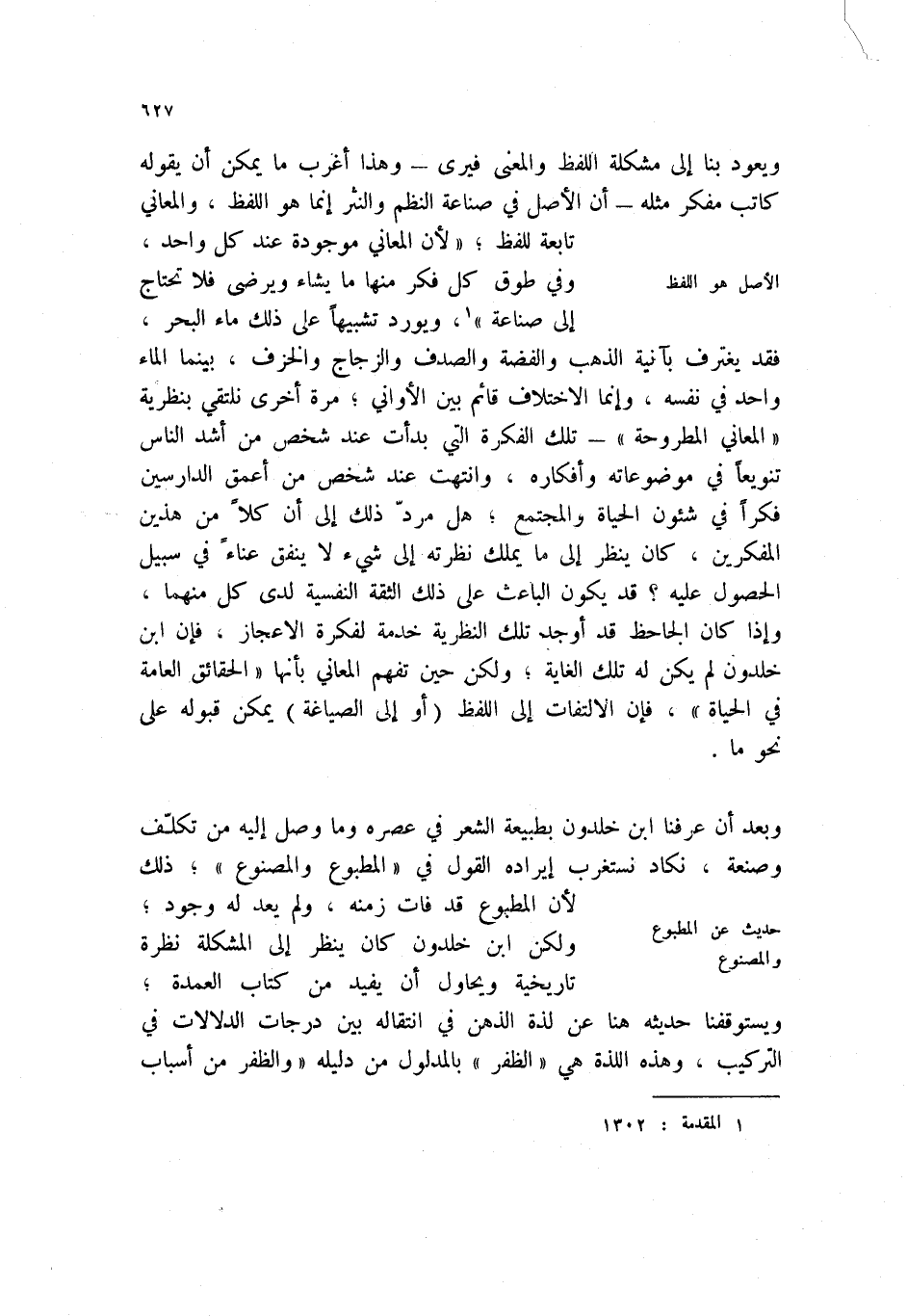 ويعود بناء إلى مشكلة اللفظ والمعنى فيرى - وهذا اغرب ما يمكن أن يقوله كاتب مفكر مثله - أن الأصل في صناعة النظم والنثر إنما هو اللفظ، والمعاني تابعة للفظ؛ " لأن المعاني موجودة عند كل واحد، وفي طوق كل فكر منها ما يشاء ويرضى فلا تحتاج إلى صناعة " (1) ، ويورد تشبيهاً على ذلك ماء البحر، فقد يغترف بآنية الذهب والفضة والصدف والزجاج والخزف، بينما الماء واحد في نفسه، وإنما الاختلاف قائم بين الأواني؛ مرة أخرى نلتقي بنظرية " المعاني المطروحة " - تلك الفكرة التي بدأت عند شخص من أشد الناس تنويعاً في موضوعاته وافكاره، وانتهت عند شخص من اعمق الدارسين فكراً في شئون الحياة والمجتمع؛ هل مرد ذلك إلى أن كلاص من هذين المفكرين، كان ينظر إلى ما يملك نظرته إلى شيء لا ينفق عناءً في سبيل الحصول عليه؟ قد يكون الباعث على ذلك الثقة النفسية لدى كل منهما، وإذا كان الجاحظ قد أوجد تلك النظرية خدمة لفكرة الإعجاز، فإن ابن خلدون لم يكن له تلك الغاية؛ ولكن حين تفهم المعاني بأنها " الحقائق العامة في الحياة "، فغن الالتفات إلى اللفظ (أو إلى الصياغة) يمكن قبوله على نحو ما.